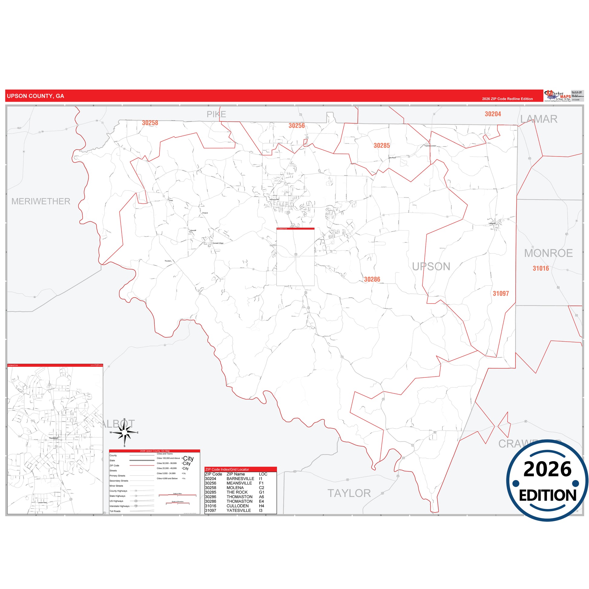 The RedLine Style map of Upson County, GA shows ZIP code areas overlaid on a detailed road network of Upson County, Georgia. Ideal for drawing locations, territories, and other applications. Base map features include all major streets and highways labeled, cities and towns, county and state boundaries, neighborhood names, railroads, and a clean white background suitable for marking and planning.