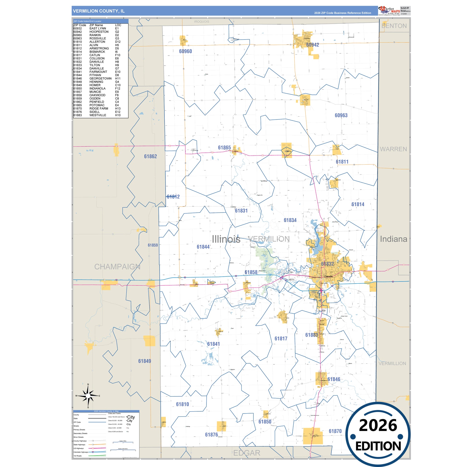 The Business Reference Style Vermilion County, IL is a detailed map that includes all towns, cities, major roadways, and highways. Available in multiple wall map sizes, perfect for home, school, office, or business display.