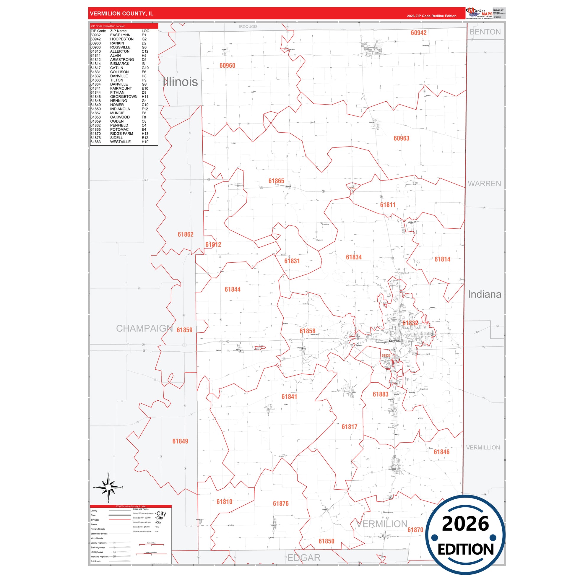 The RedLine Style map of Vermilion County, IL shows ZIP code areas overlaid on a detailed road network of Vermilion County, Illinois. Ideal for drawing locations, territories, and other applications. Base map features include all major streets and highways labeled, cities and towns, county and state boundaries, neighborhood names, railroads, and a clean white background suitable for marking and planning.
