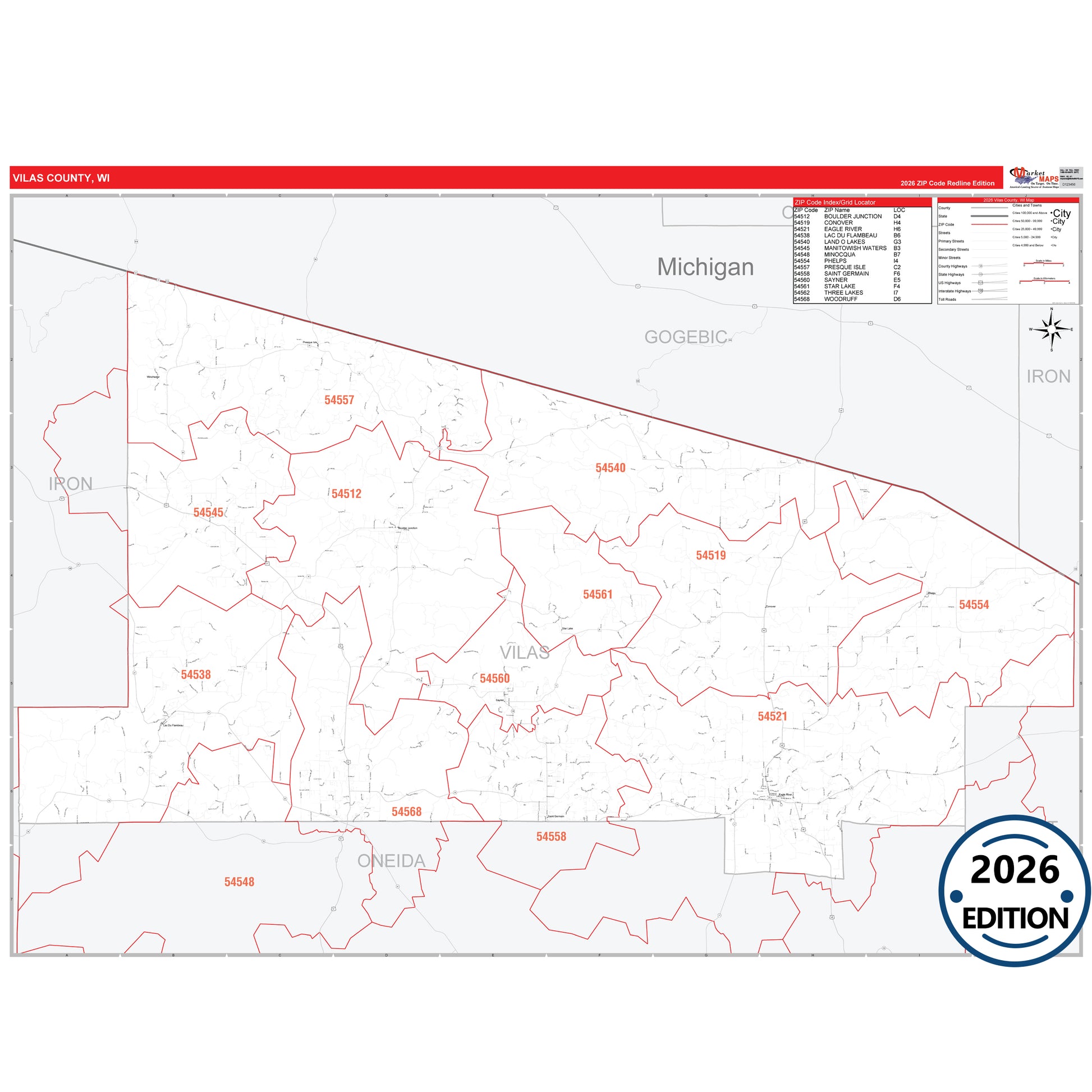 The RedLine Style map of Vilas County, WI shows ZIP code areas overlaid on a detailed road network of Vilas County, Wisconsin. Ideal for drawing locations, territories, and other applications. Base map features include all major streets and highways labeled, cities and towns, county and state boundaries, neighborhood names, railroads, and a clean white background suitable for marking and planning.