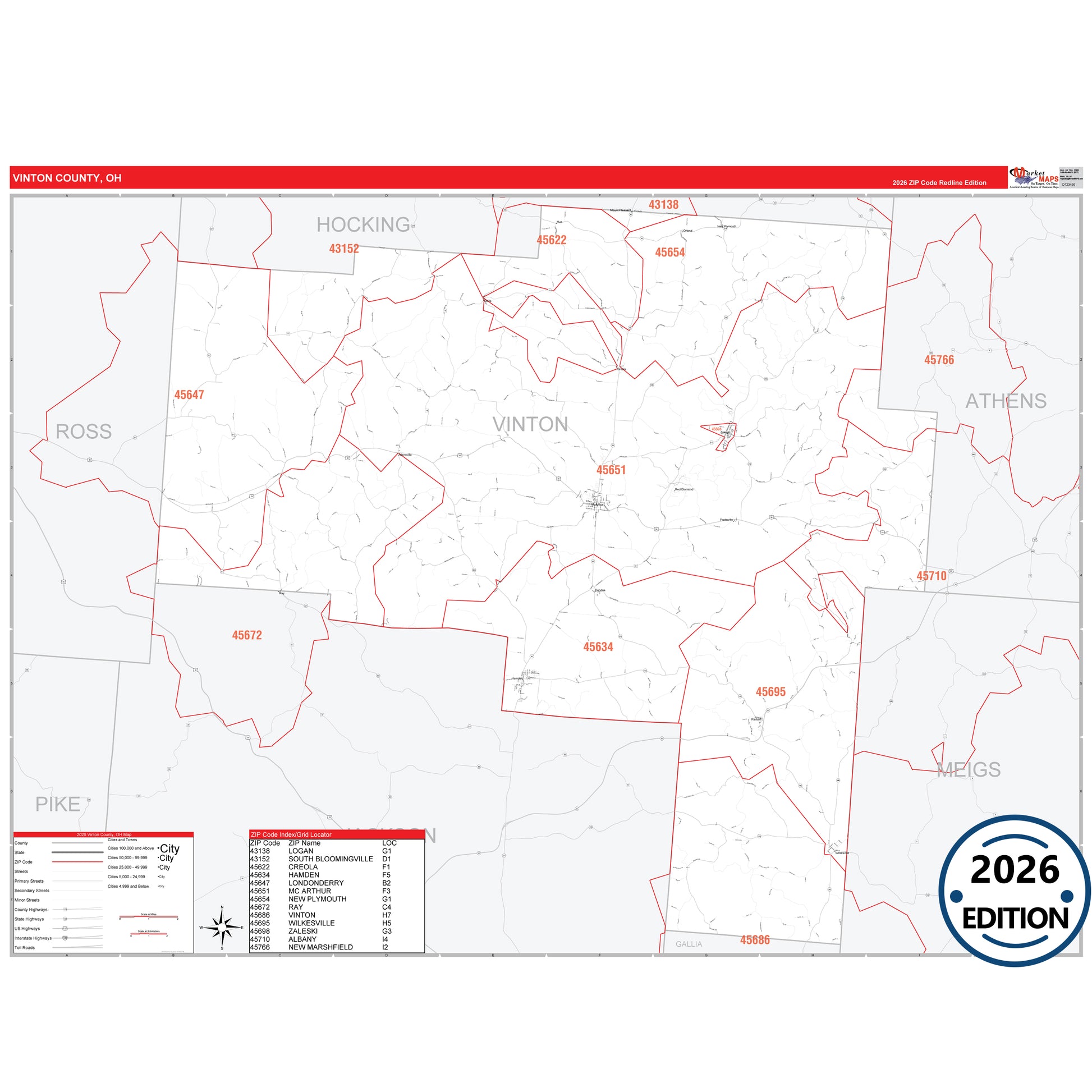 The RedLine Style map of Vinton County, OH shows ZIP code areas overlaid on a detailed road network of Vinton County, Ohio. Ideal for drawing locations, territories, and other applications. Base map features include all major streets and highways labeled, cities and towns, county and state boundaries, neighborhood names, railroads, and a clean white background suitable for marking and planning.