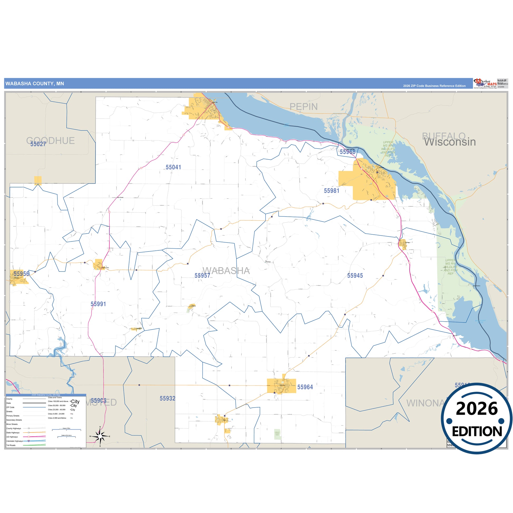 The Business Reference Style Wabasha County, MN is a detailed map that includes all towns, cities, major roadways, and highways. Available in multiple wall map sizes, perfect for home, school, office, or business display.