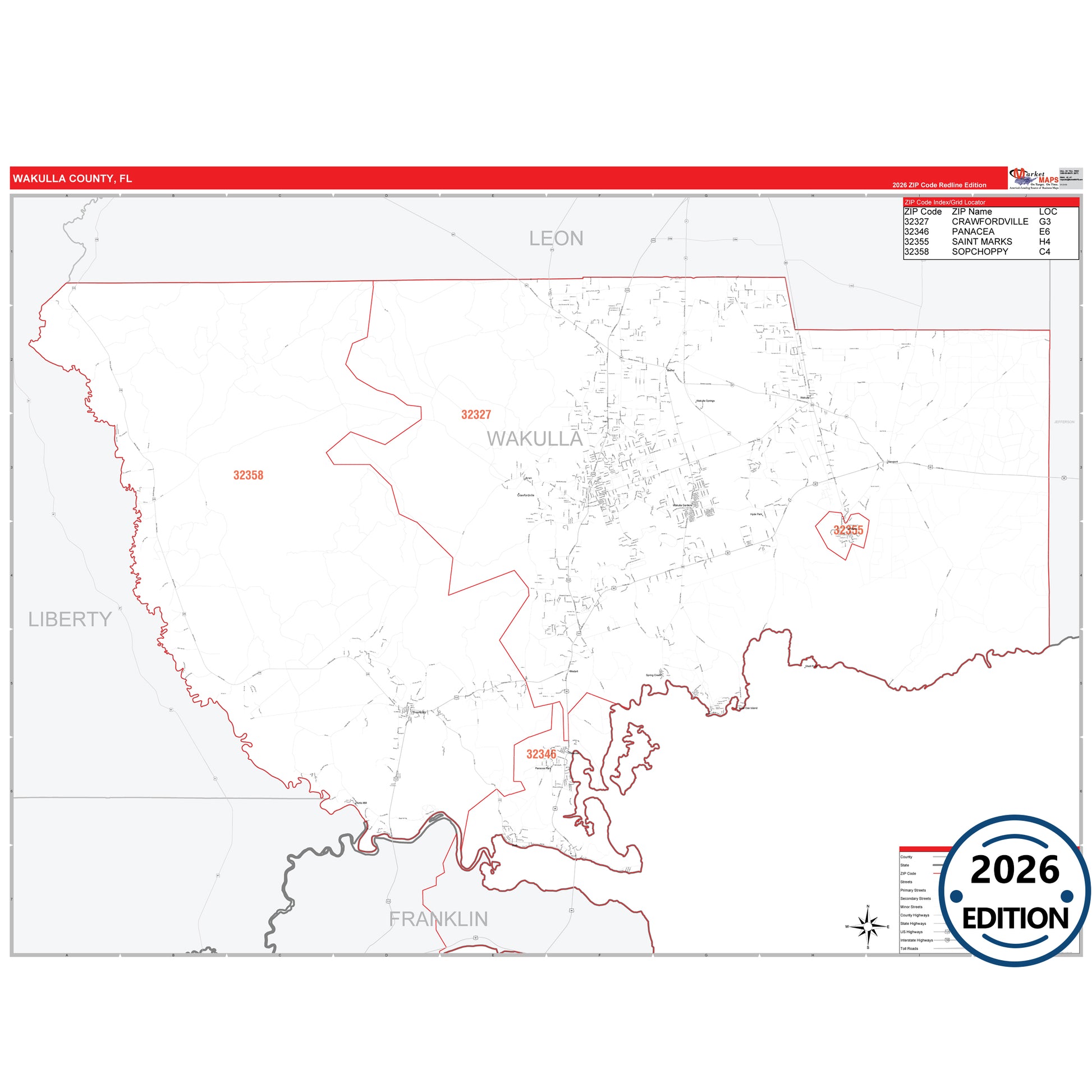 The RedLine Style map of Wakulla County, FL shows ZIP code areas overlaid on a detailed road network of Wakulla County, Florida. Ideal for drawing locations, territories, and other applications. Base map features include all major streets and highways labeled, cities and towns, county and state boundaries, neighborhood names, railroads, and a clean white background suitable for marking and planning.