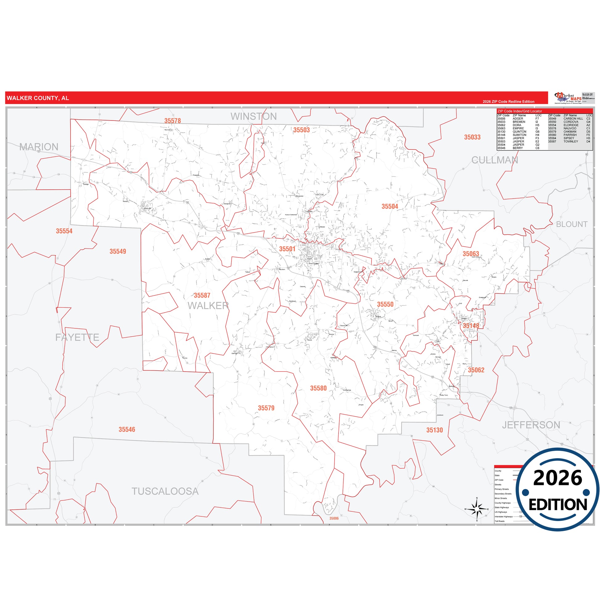The RedLine Style map of Walker County, AL shows ZIP code areas overlaid on a detailed road network of Walker County, Alabama. Ideal for drawing locations, territories, and other applications. Base map features include all major streets and highways labeled, cities and towns, county and state boundaries, neighborhood names, railroads, and a clean white background suitable for marking and planning.