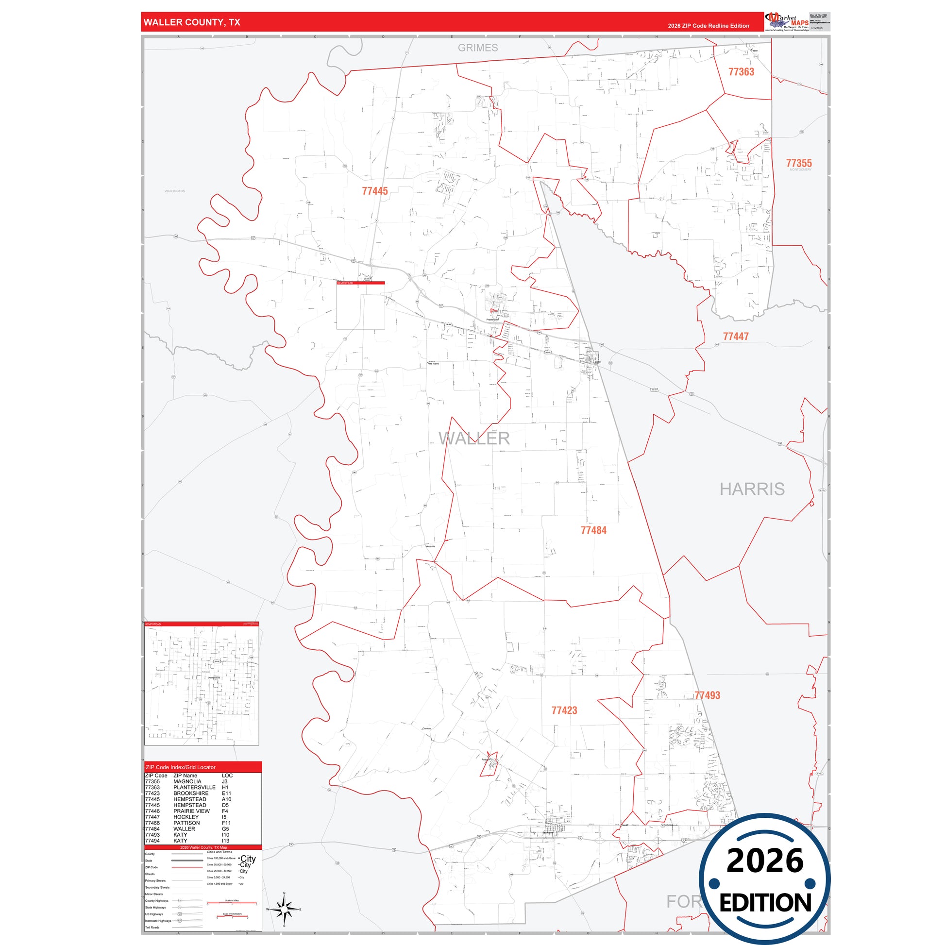 The RedLine Style map of Waller County, TX shows ZIP code areas overlaid on a detailed road network of Waller County, Texas. Ideal for drawing locations, territories, and other applications. Base map features include all major streets and highways labeled, cities and towns, county and state boundaries, neighborhood names, railroads, and a clean white background suitable for marking and planning.