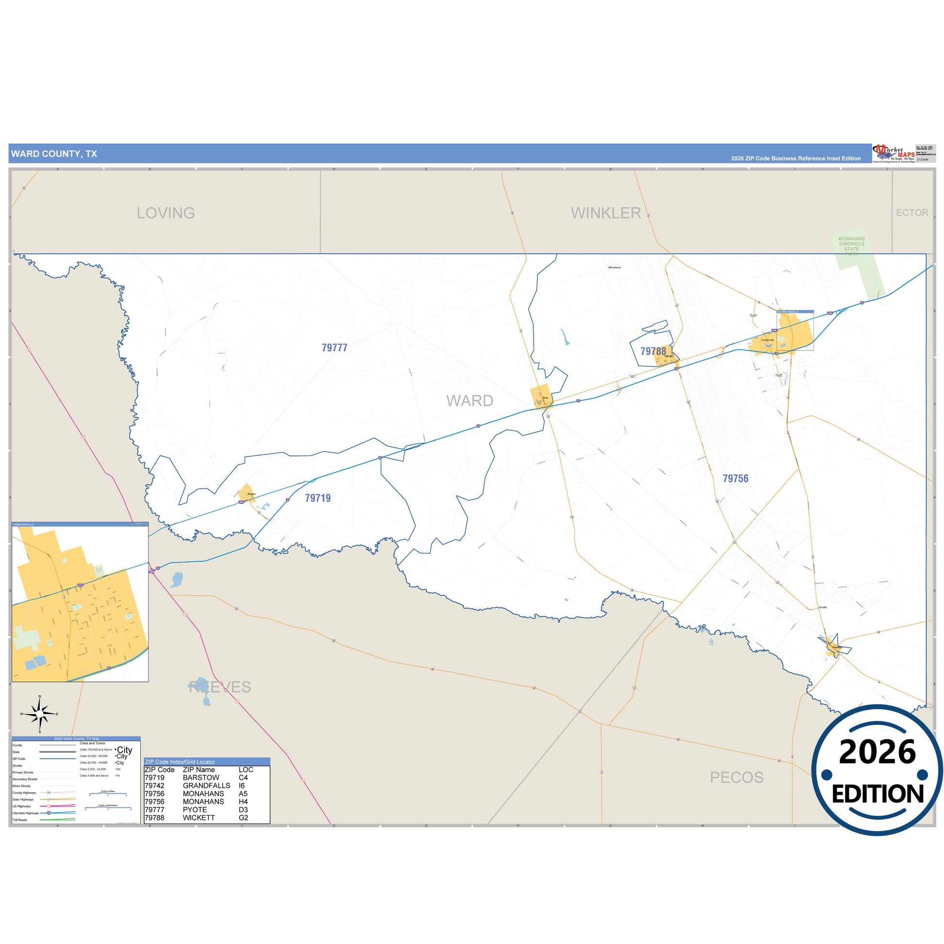 The Business Reference Style Ward County, TX is a detailed map that includes all towns, cities, major roadways, and highways. Available in multiple wall map sizes, perfect for home, school, office, or business display.