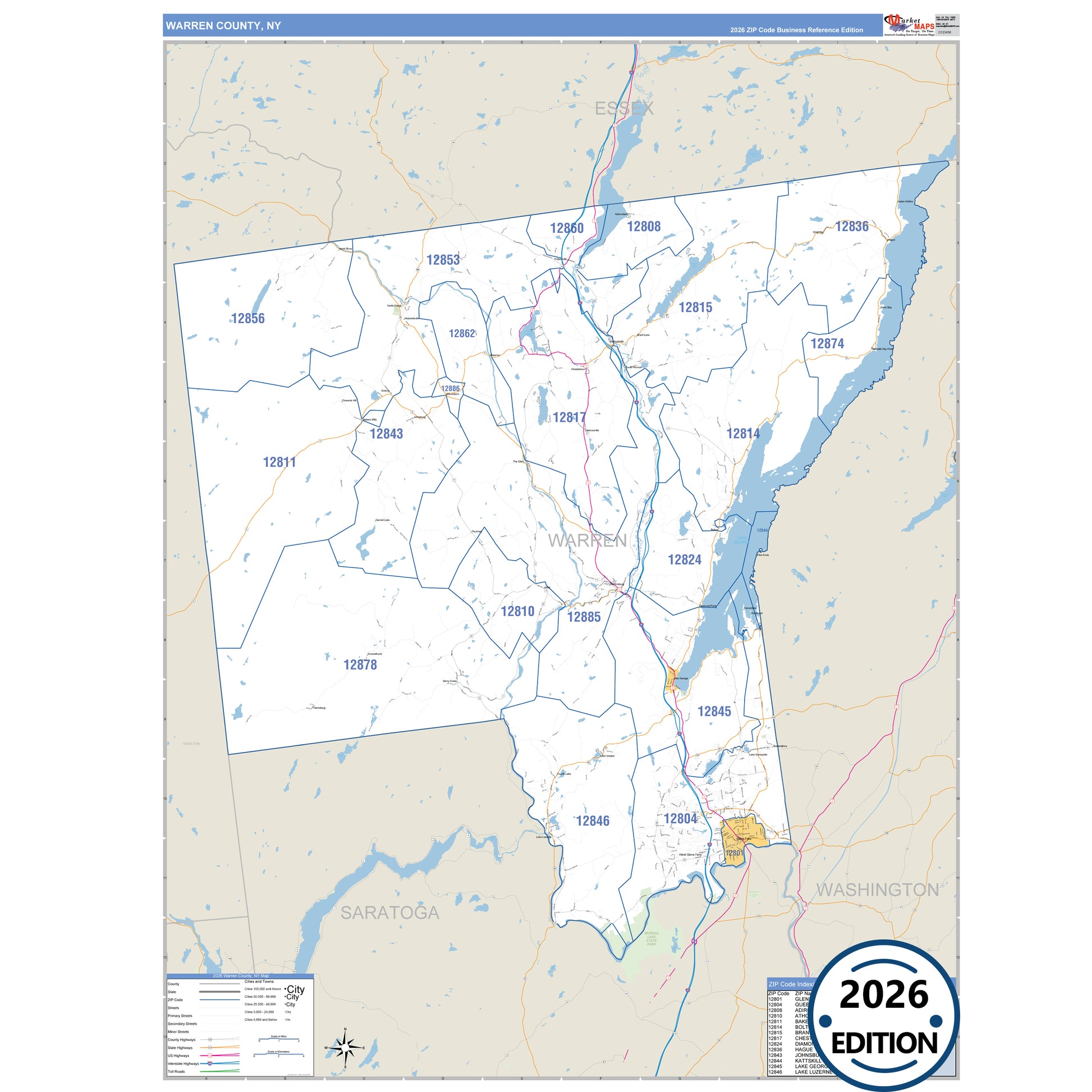 The Business Reference Style Warren County, NY is a detailed map that includes all towns, cities, major roadways, and highways. Available in multiple wall map sizes, perfect for home, school, office, or business display.