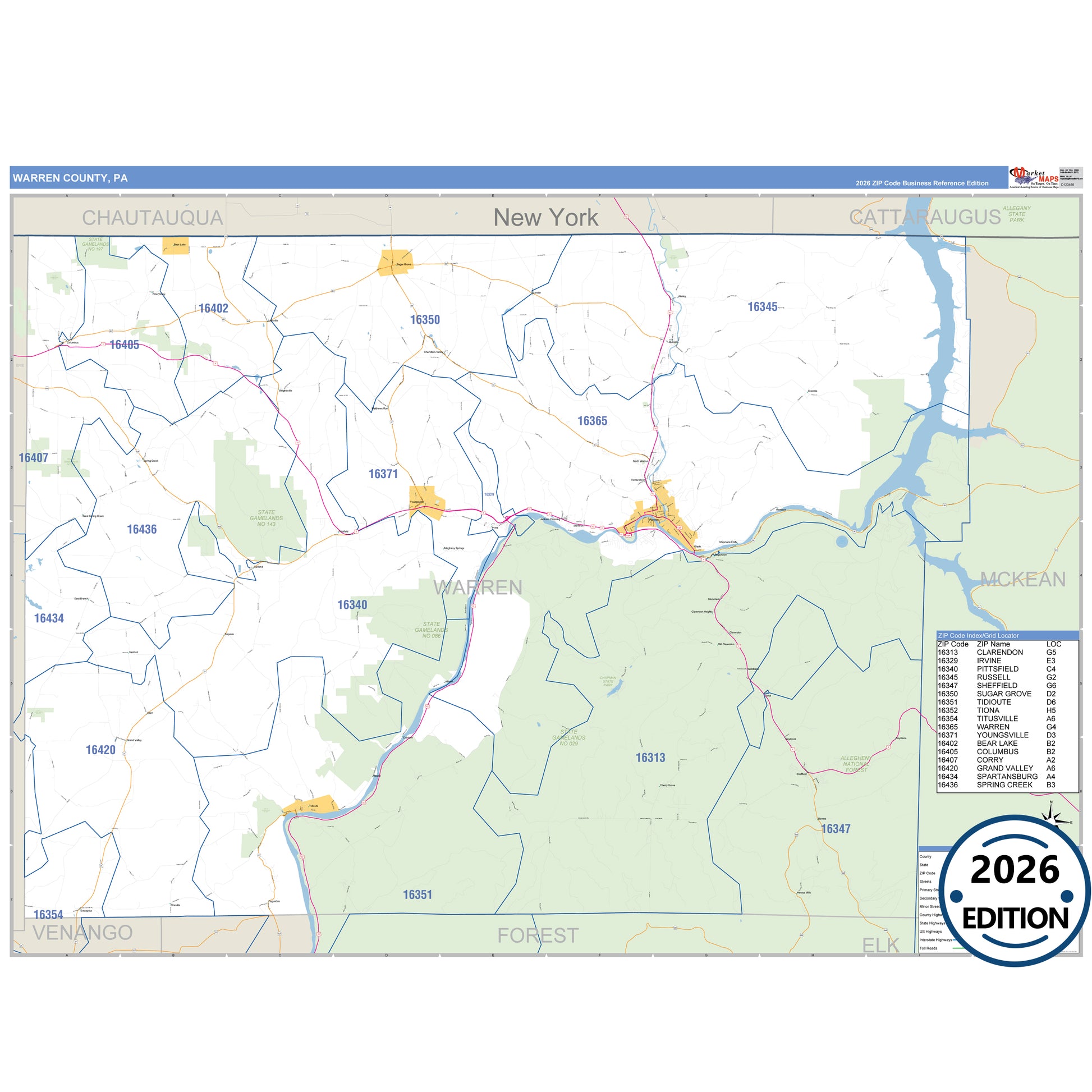 The Business Reference Style Warren County, PA is a detailed map that includes all towns, cities, major roadways, and highways. Available in multiple wall map sizes, perfect for home, school, office, or business display.