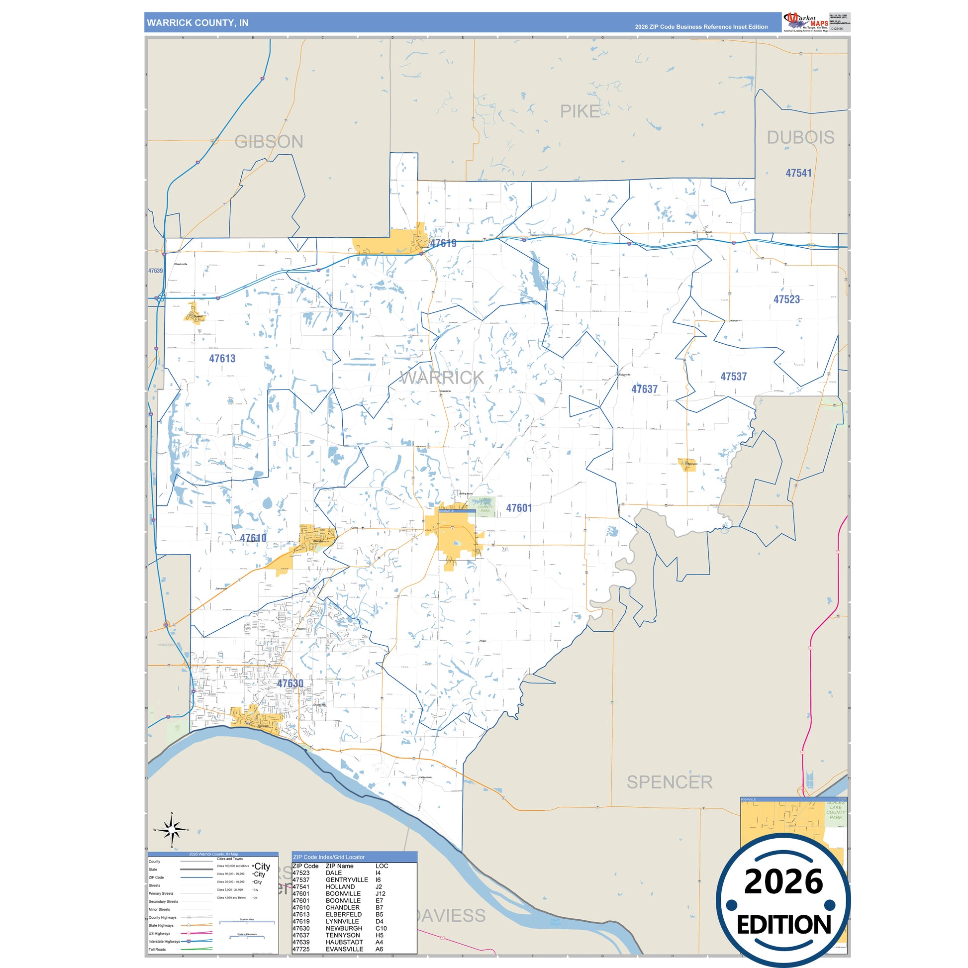 The Business Reference Style Warrick County, IN is a detailed map that includes all towns, cities, major roadways, and highways. Available in multiple wall map sizes, perfect for home, school, office, or business display.