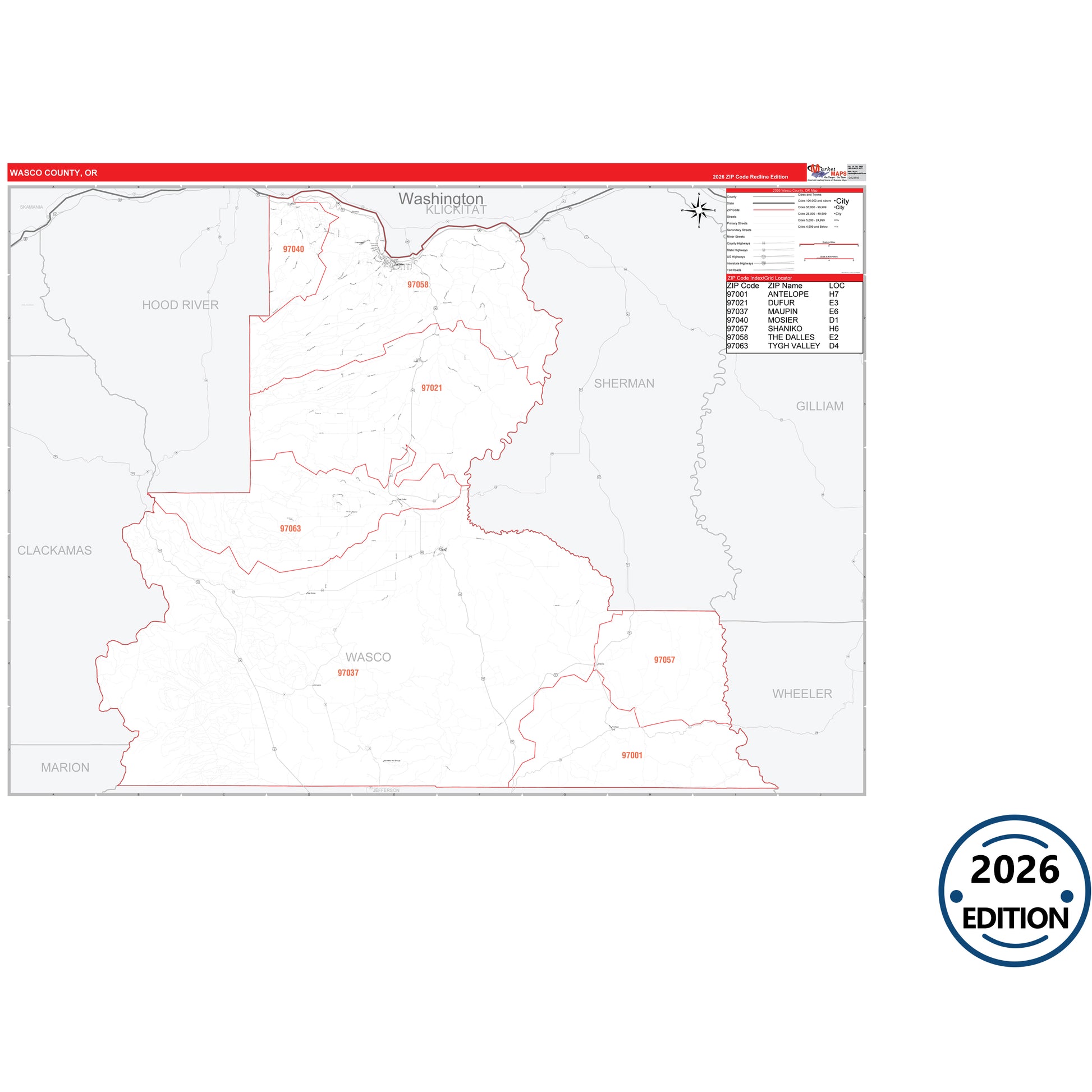 The RedLine Style map of Wasco County, OR shows ZIP code areas overlaid on a detailed road network of Wasco County, Oregon. Ideal for drawing locations, territories, and other applications. Base map features include all major streets and highways labeled, cities and towns, county and state boundaries, neighborhood names, railroads, and a clean white background suitable for marking and planning.