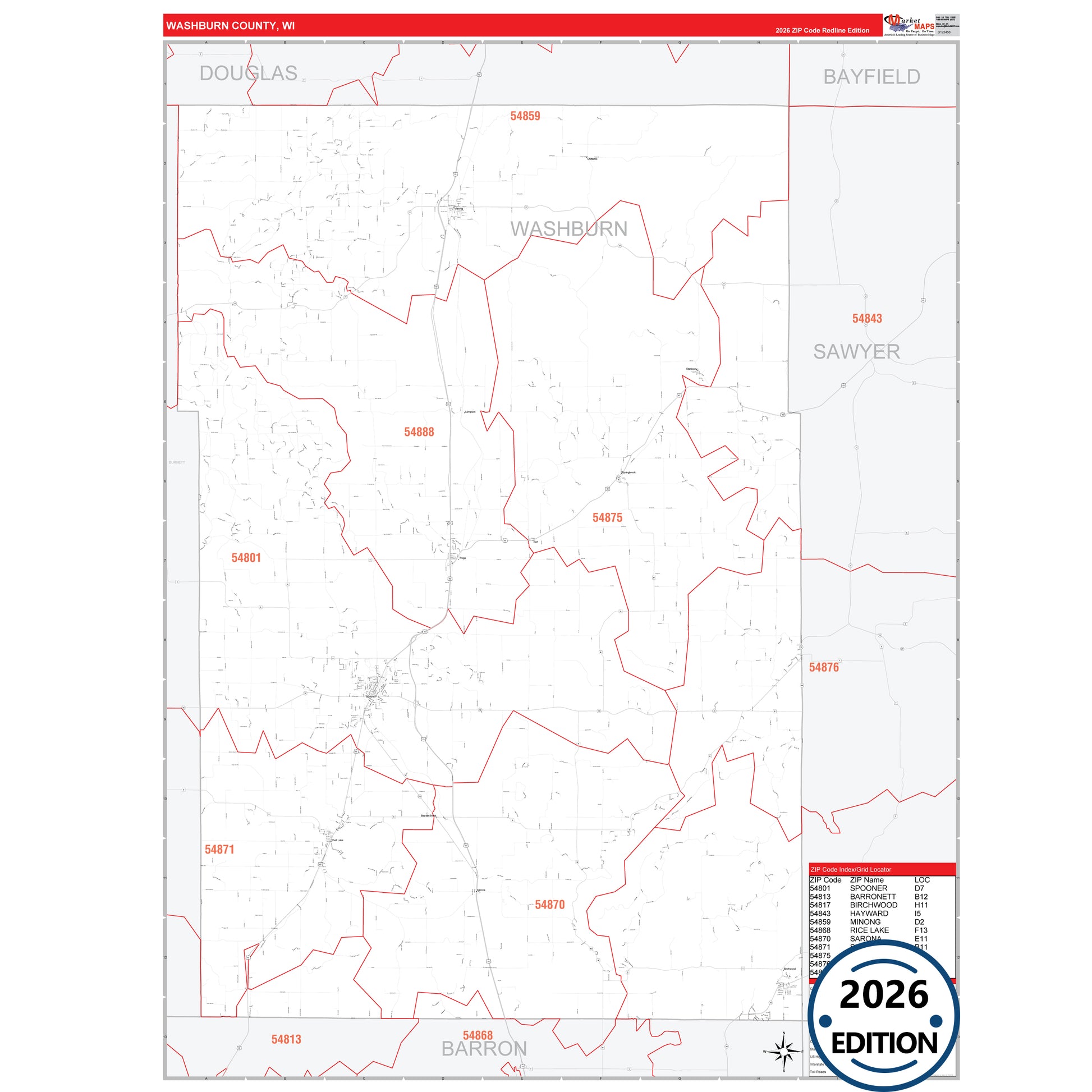 The RedLine Style map of Washburn County, WI shows ZIP code areas overlaid on a detailed road network of Washburn County, Wisconsin. Ideal for drawing locations, territories, and other applications. Base map features include all major streets and highways labeled, cities and towns, county and state boundaries, neighborhood names, railroads, and a clean white background suitable for marking and planning.