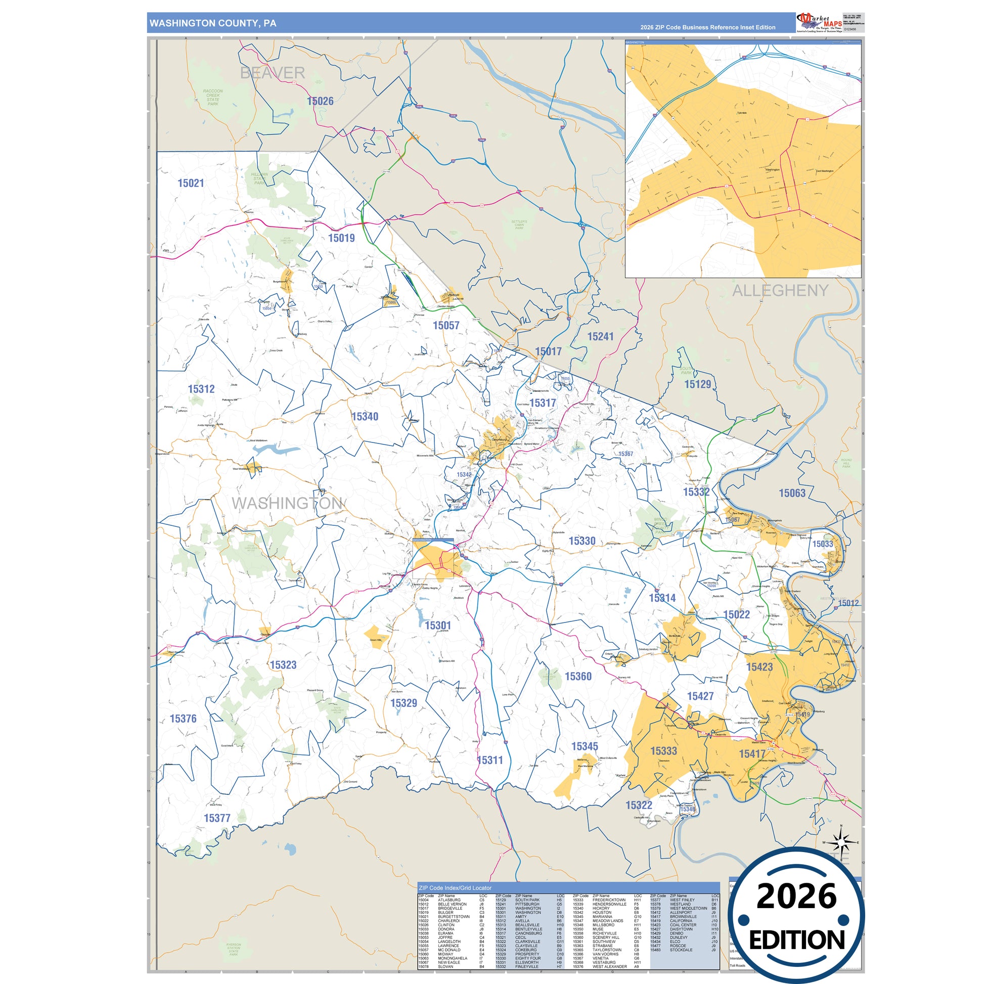The Business Reference Style Washington County, PA is a detailed map that includes all towns, cities, major roadways, and highways. Available in multiple wall map sizes, perfect for home, school, office, or business display.