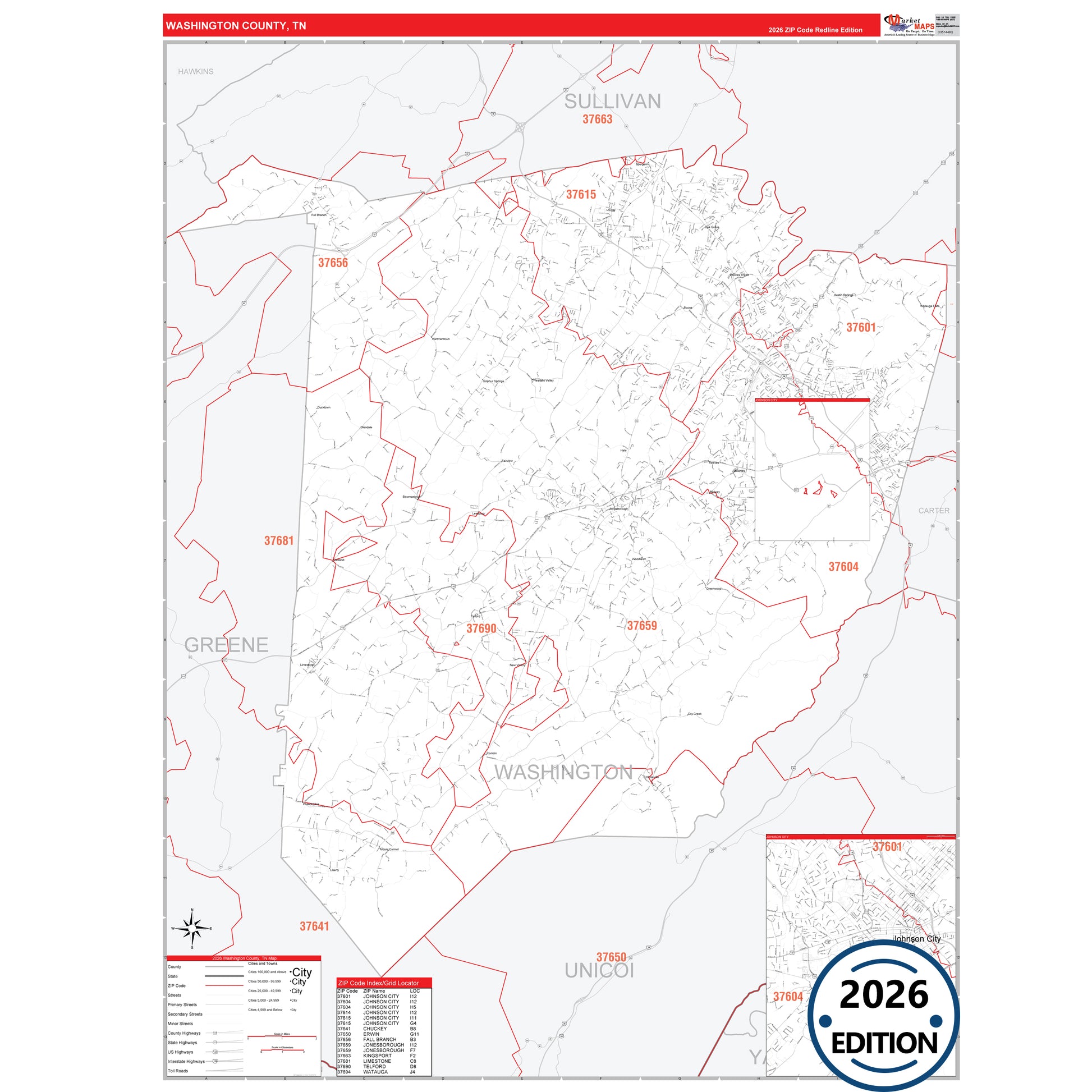 The RedLine Style map of Washington County, TN shows ZIP code areas overlaid on a detailed road network of Washington County, Tennessee. Ideal for drawing locations, territories, and other applications. Base map features include all major streets and highways labeled, cities and towns, county and state boundaries, neighborhood names, railroads, and a clean white background suitable for marking and planning.