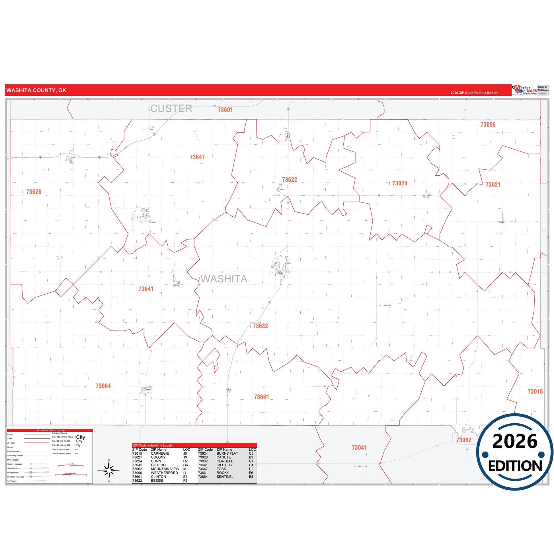 The RedLine Style map of Washita County, OK shows ZIP code areas overlaid on a detailed road network of Washita County, Oklahoma. Ideal for drawing locations, territories, and other applications. Base map features include all major streets and highways labeled, cities and towns, county and state boundaries, neighborhood names, railroads, and a clean white background suitable for marking and planning.