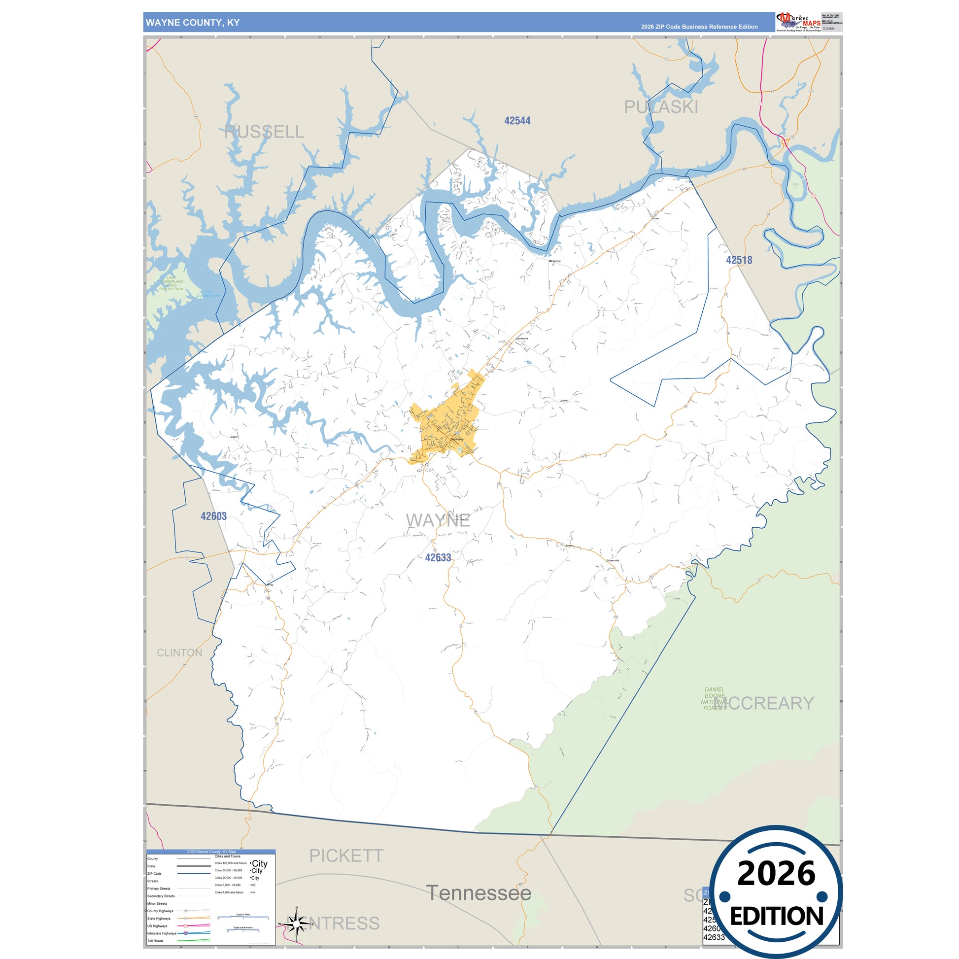 The Business Reference Style Wayne County, KY is a detailed map that includes all towns, cities, major roadways, and highways. Available in multiple wall map sizes, perfect for home, school, office, or business display.