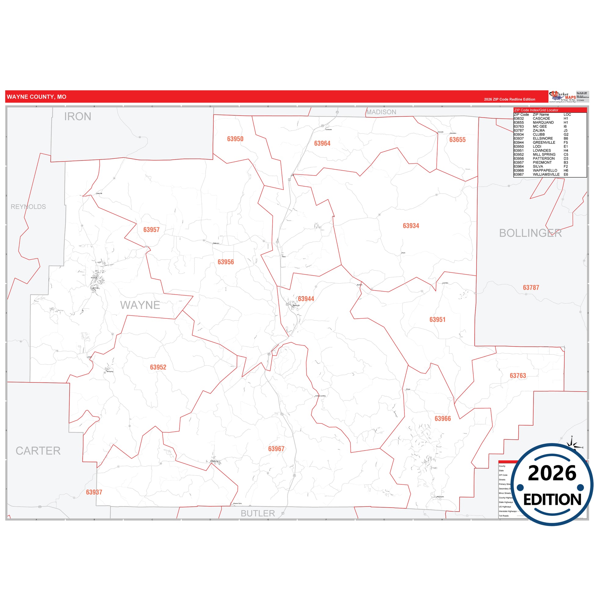 The RedLine Style map of Wayne County, MO shows ZIP code areas overlaid on a detailed road network of Wayne County, Missouri. Ideal for drawing locations, territories, and other applications. Base map features include all major streets and highways labeled, cities and towns, county and state boundaries, neighborhood names, railroads, and a clean white background suitable for marking and planning.
