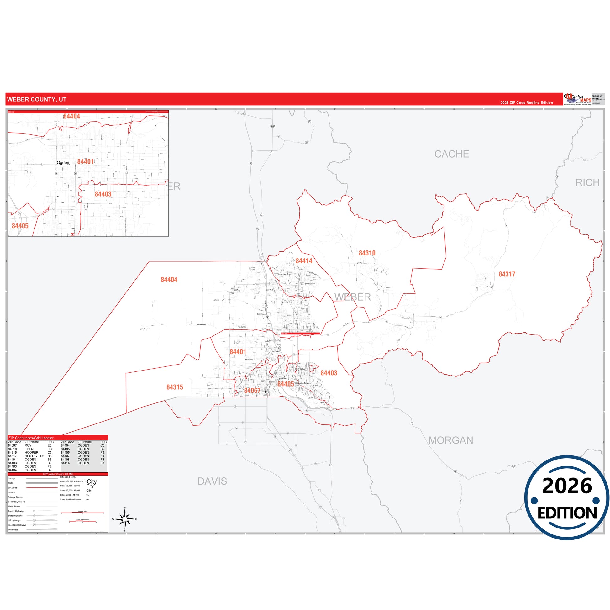 The RedLine Style map of Weber County, UT shows ZIP code areas overlaid on a detailed road network of Weber County, Utah. Ideal for drawing locations, territories, and other applications. Base map features include all major streets and highways labeled, cities and towns, county and state boundaries, neighborhood names, railroads, and a clean white background suitable for marking and planning.