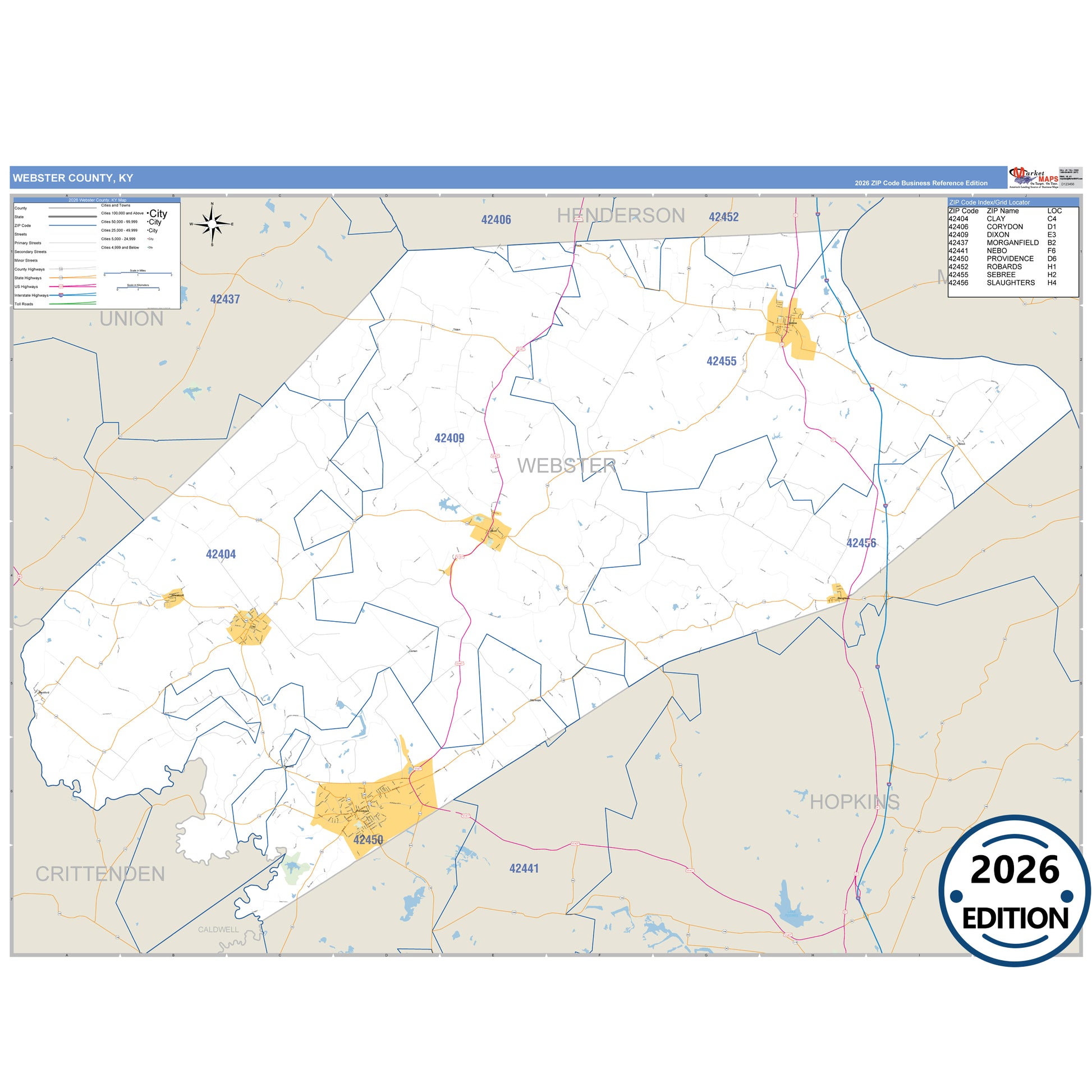 The Business Reference Style Webster County, KY is a detailed map that includes all towns, cities, major roadways, and highways. Available in multiple wall map sizes, perfect for home, school, office, or business display.