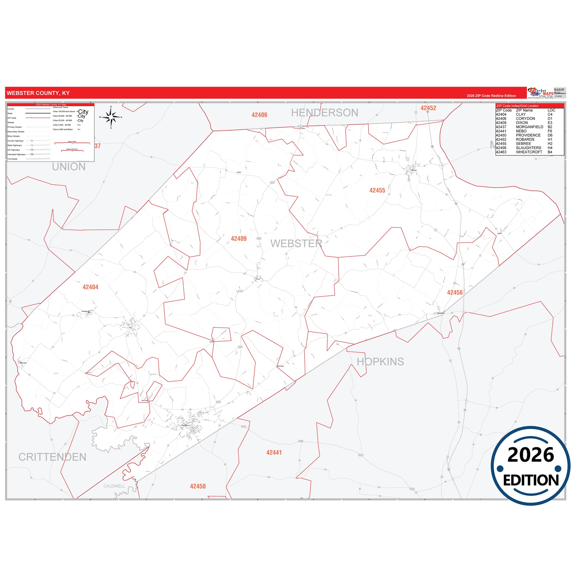 The RedLine Style map of Webster County, KY shows ZIP code areas overlaid on a detailed road network of Webster County, Kentucky. Ideal for drawing locations, territories, and other applications. Base map features include all major streets and highways labeled, cities and towns, county and state boundaries, neighborhood names, railroads, and a clean white background suitable for marking and planning.