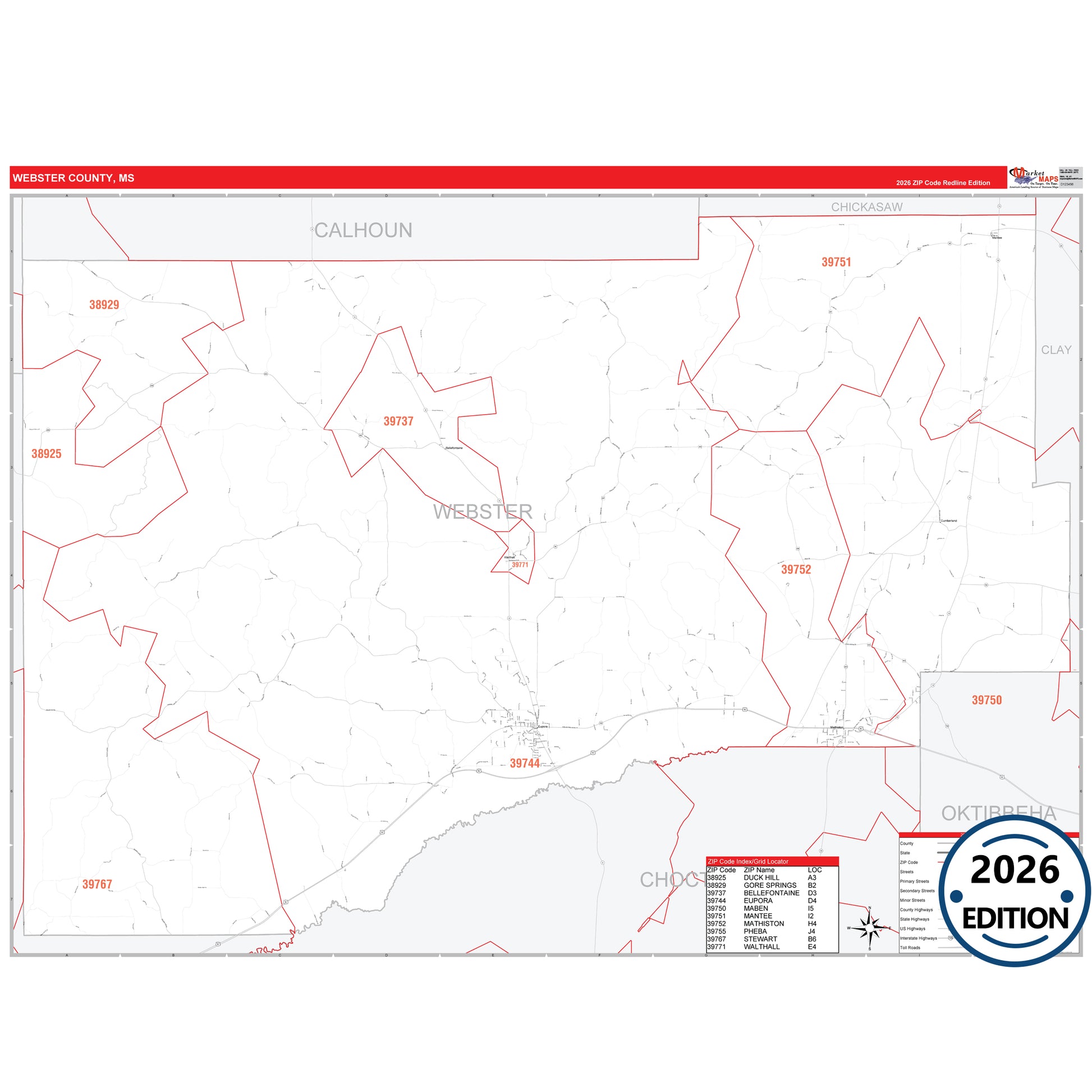 The RedLine Style map of Webster County, MS shows ZIP code areas overlaid on a detailed road network of Webster County, Mississippi. Ideal for drawing locations, territories, and other applications. Base map features include all major streets and highways labeled, cities and towns, county and state boundaries, neighborhood names, railroads, and a clean white background suitable for marking and planning.