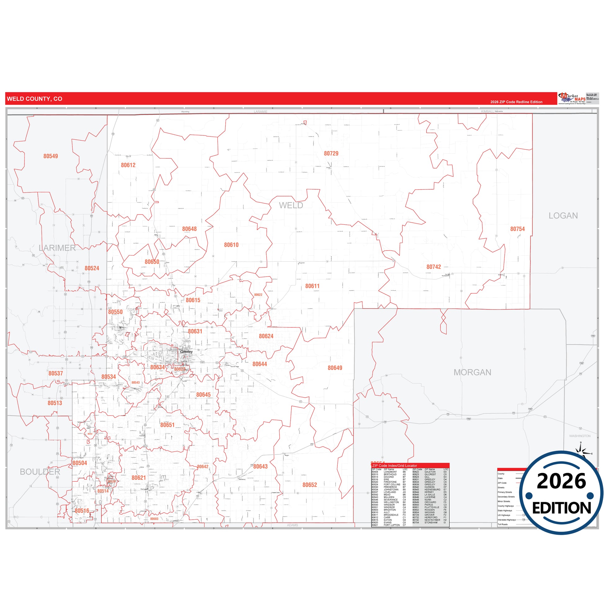 The RedLine Style map of Weld County, CO shows ZIP code areas overlaid on a detailed road network of Weld County, Colorado. Ideal for drawing locations, territories, and other applications. Base map features include all major streets and highways labeled, cities and towns, county and state boundaries, neighborhood names, railroads, and a clean white background suitable for marking and planning.