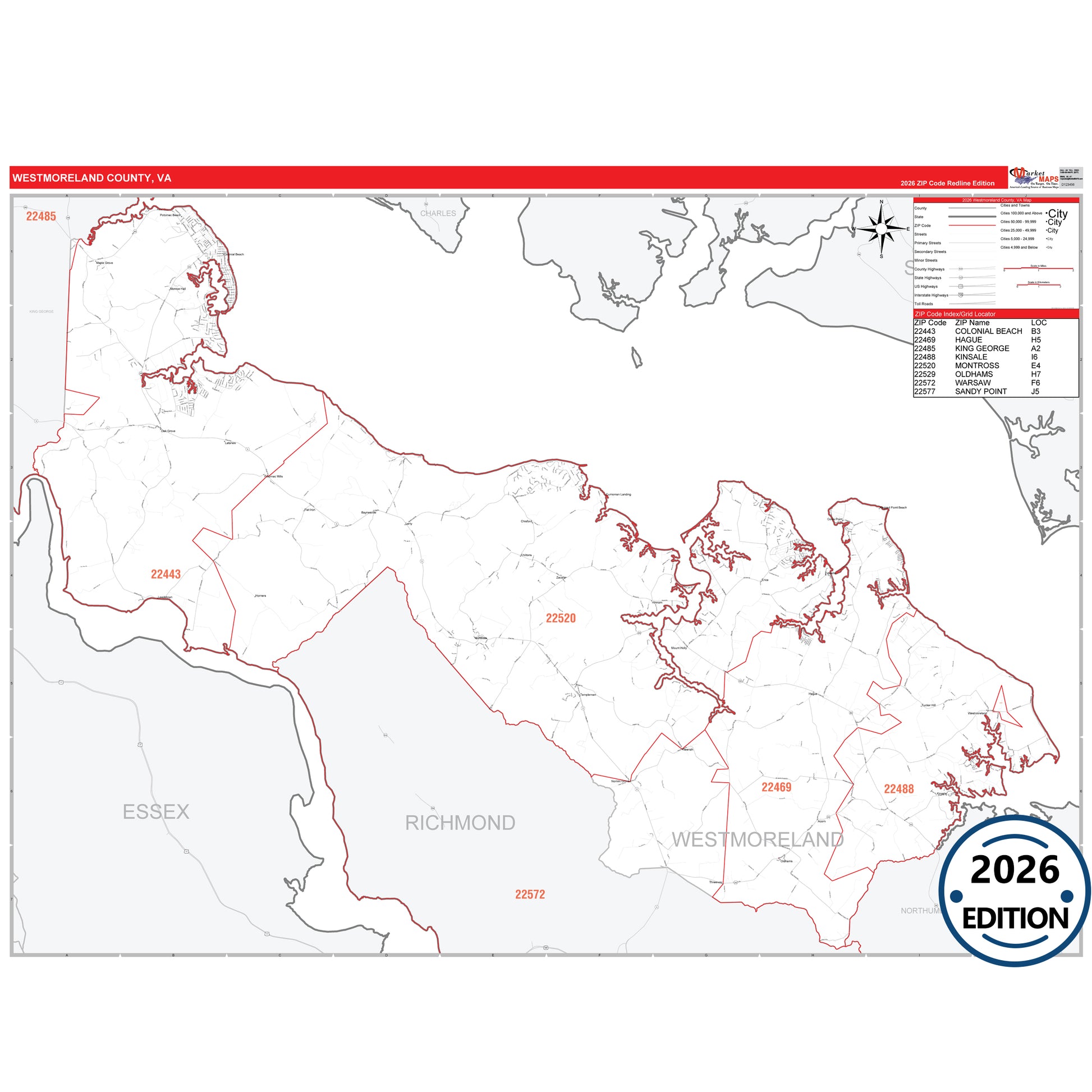 The RedLine Style map of Westmoreland County, VA shows ZIP code areas overlaid on a detailed road network of Westmoreland County, Virginia. Ideal for drawing locations, territories, and other applications. Base map features include all major streets and highways labeled, cities and towns, county and state boundaries, neighborhood names, railroads, and a clean white background suitable for marking and planning.