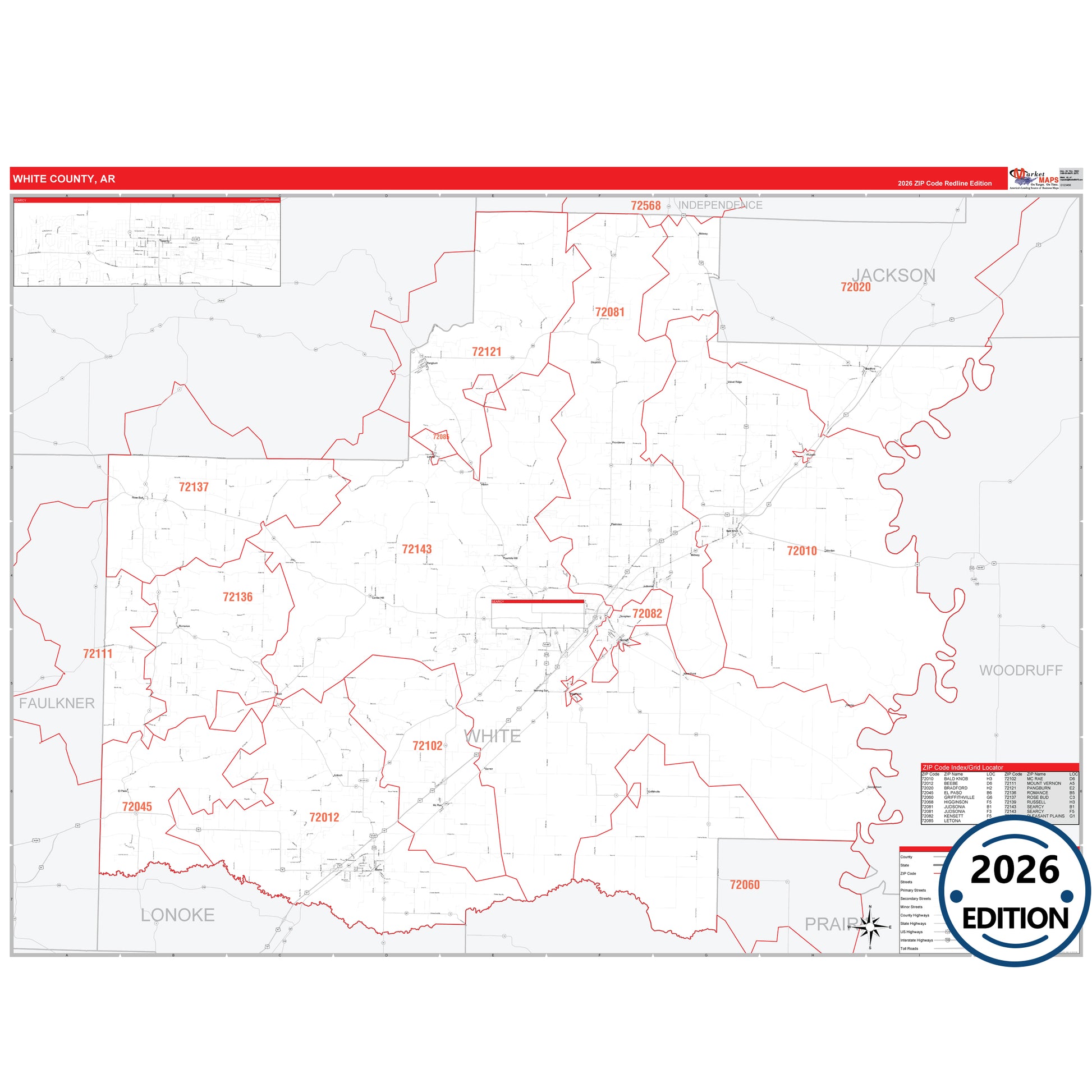 The RedLine Style map of White County, AR shows ZIP code areas overlaid on a detailed road network of White County, Arkansas. Ideal for drawing locations, territories, and other applications. Base map features include all major streets and highways labeled, cities and towns, county and state boundaries, neighborhood names, railroads, and a clean white background suitable for marking and planning.