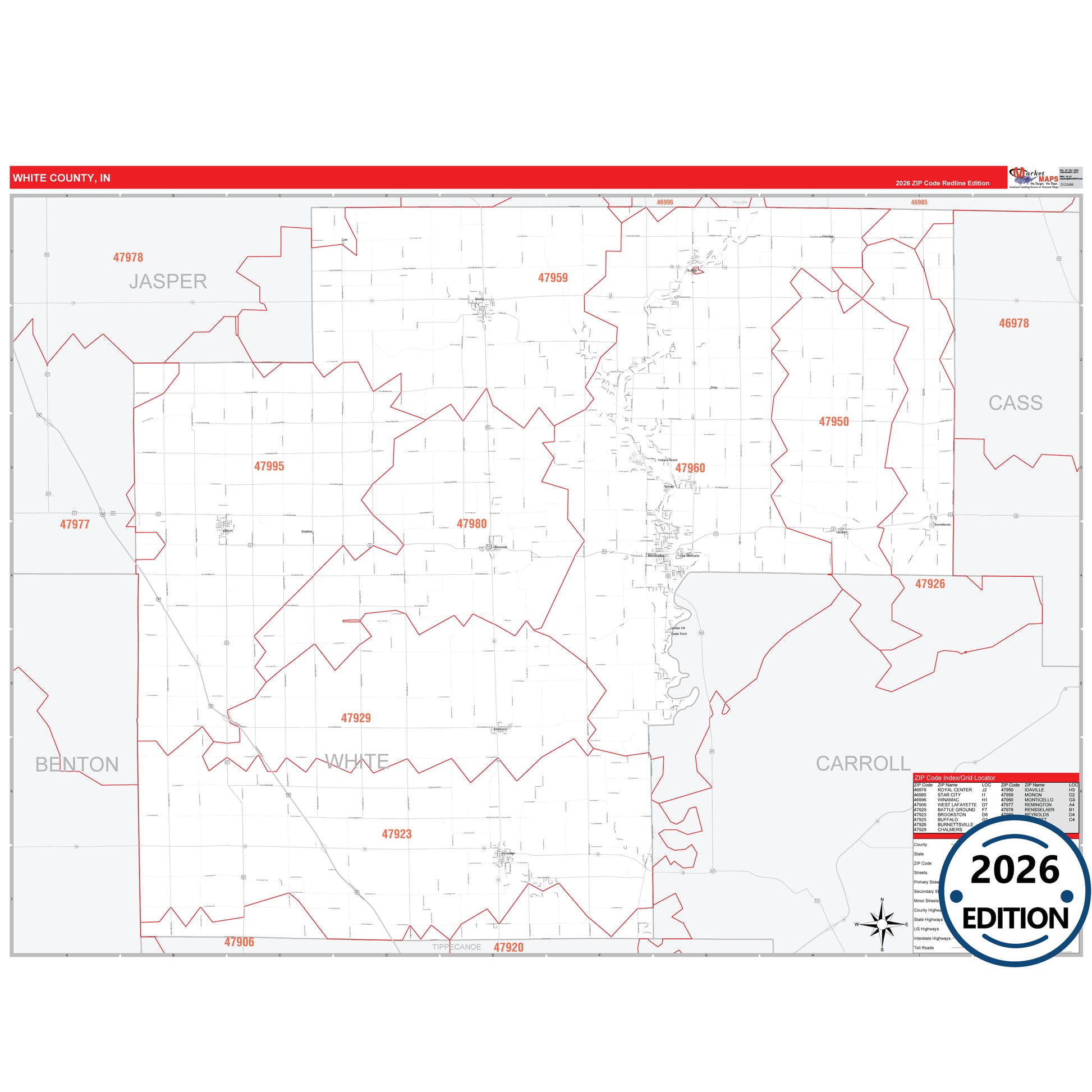 The RedLine Style map of White County, IN shows ZIP code areas overlaid on a detailed road network of White County, Indiana. Ideal for drawing locations, territories, and other applications. Base map features include all major streets and highways labeled, cities and towns, county and state boundaries, neighborhood names, railroads, and a clean white background suitable for marking and planning.
