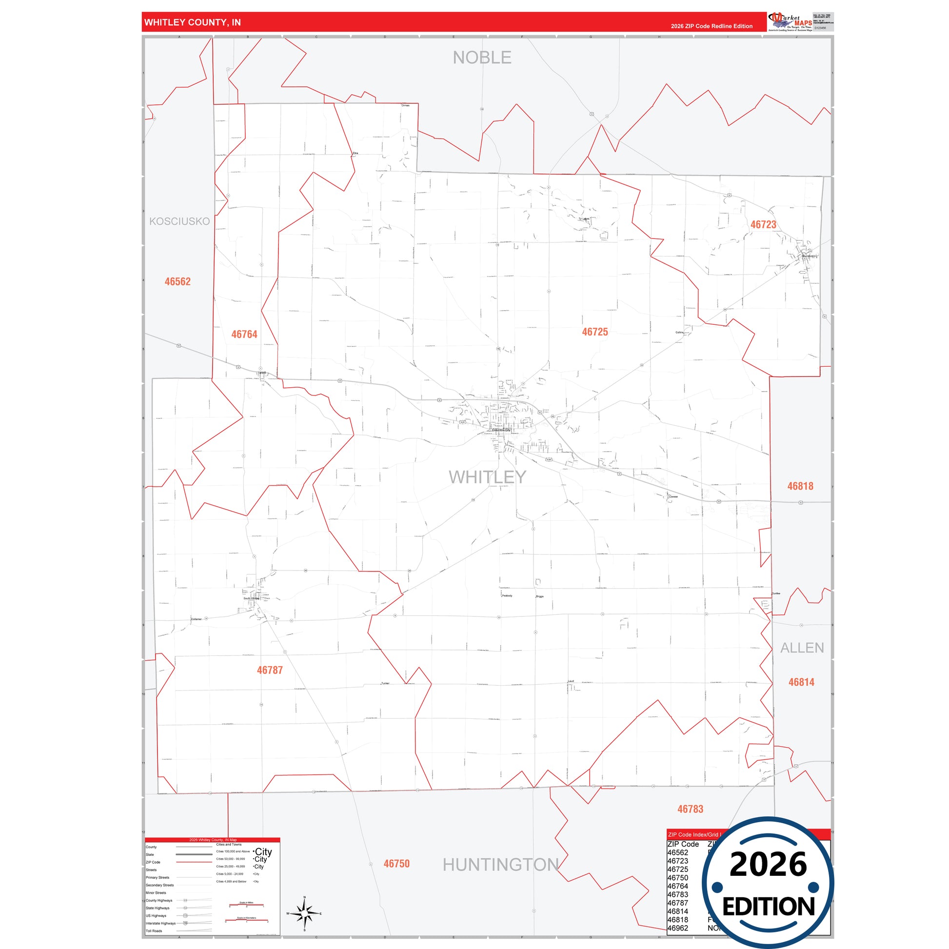 The RedLine Style map of Whitley County, IN shows ZIP code areas overlaid on a detailed road network of Whitley County, Indiana. Ideal for drawing locations, territories, and other applications. Base map features include all major streets and highways labeled, cities and towns, county and state boundaries, neighborhood names, railroads, and a clean white background suitable for marking and planning.