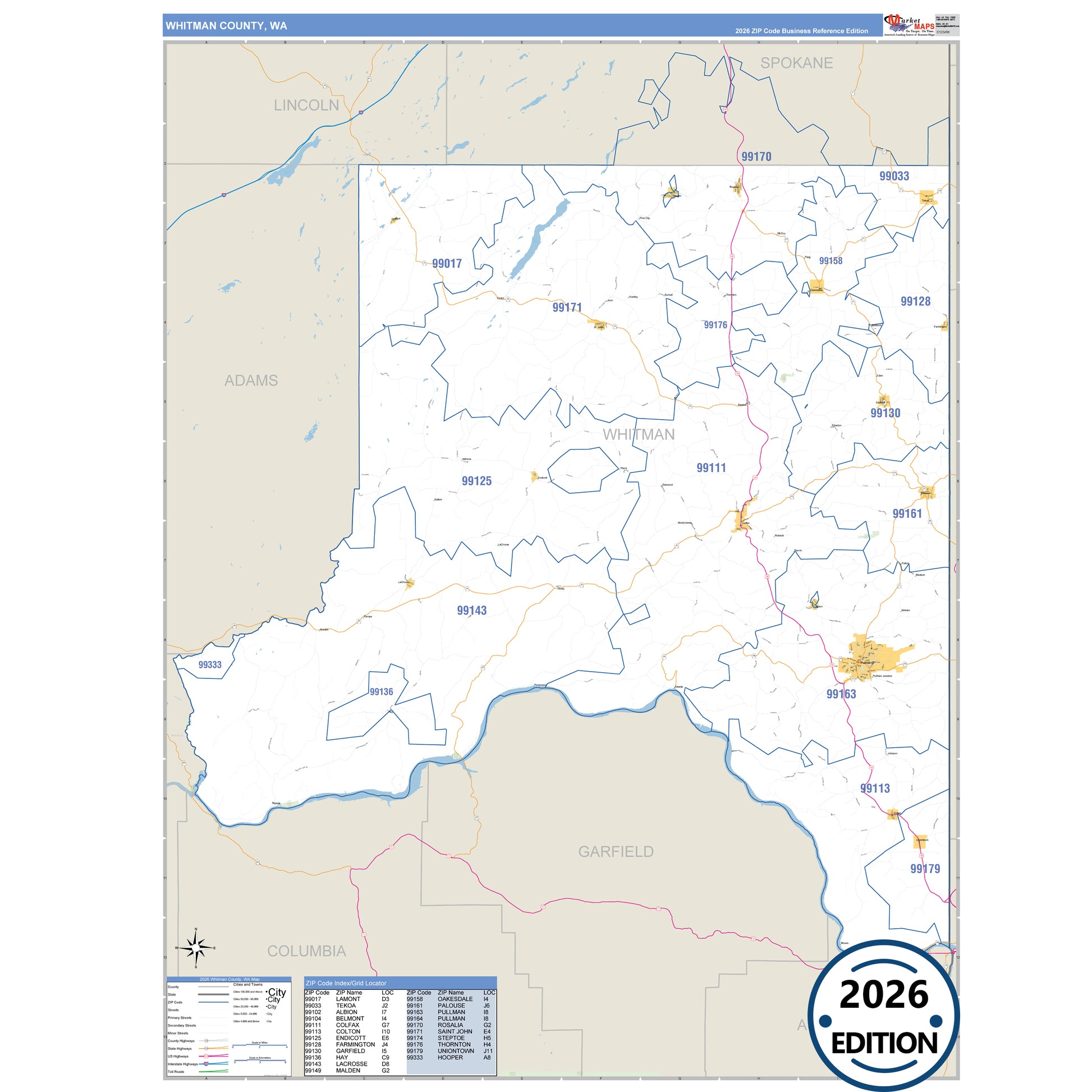 The Business Reference Style Whitman County, WA is a detailed map that includes all towns, cities, major roadways, and highways. Available in multiple wall map sizes, perfect for home, school, office, or business display.