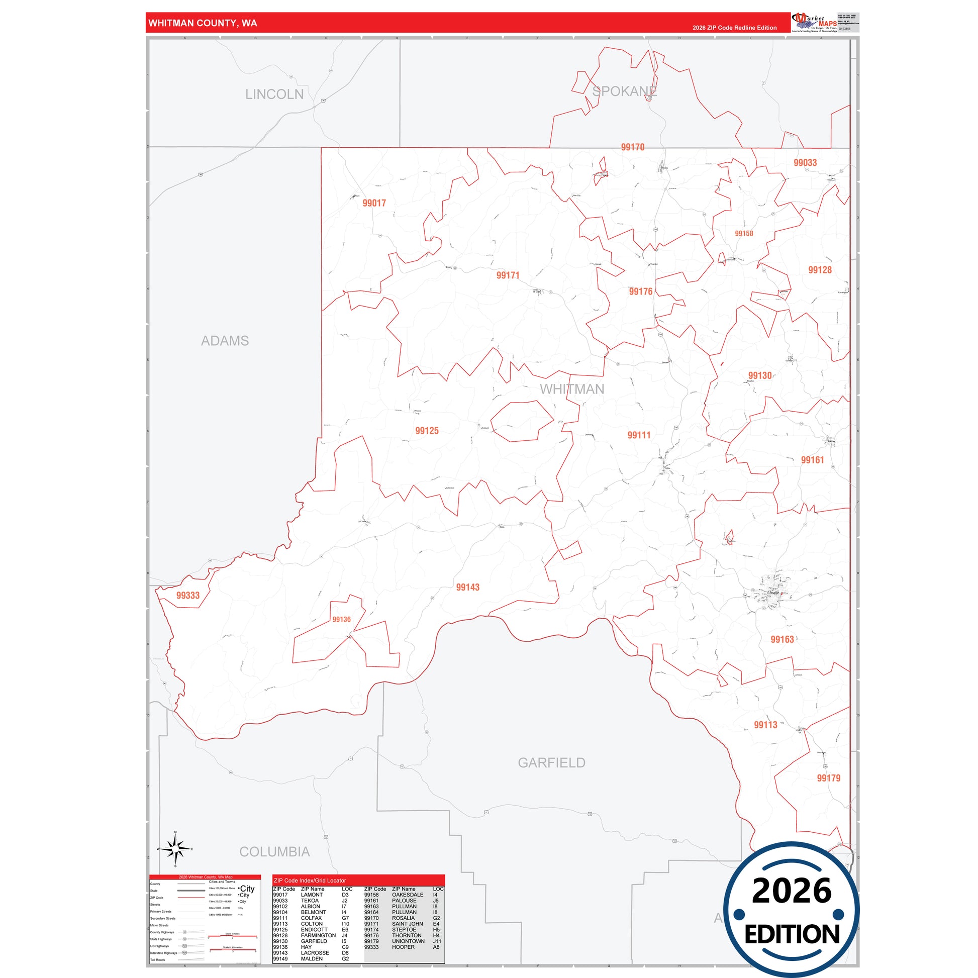 The RedLine Style map of Whitman County, WA shows ZIP code areas overlaid on a detailed road network of Whitman County, Washington. Ideal for drawing locations, territories, and other applications. Base map features include all major streets and highways labeled, cities and towns, county and state boundaries, neighborhood names, railroads, and a clean white background suitable for marking and planning.