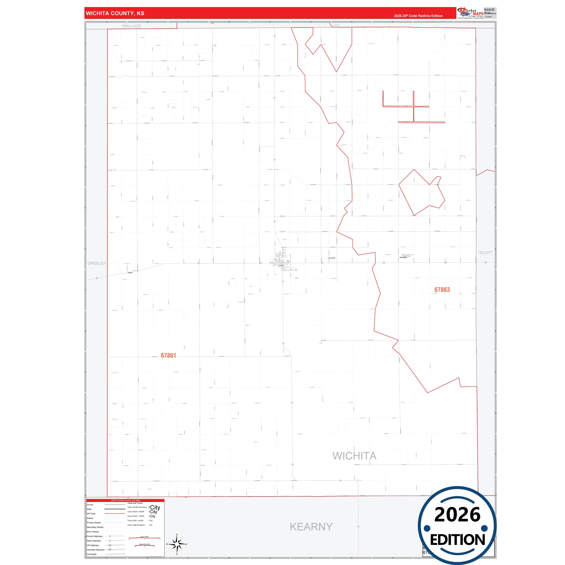 The RedLine Style map of Wichita County, KS shows ZIP code areas overlaid on a detailed road network of Wichita County, Kansas. Ideal for drawing locations, territories, and other applications. Base map features include all major streets and highways labeled, cities and towns, county and state boundaries, neighborhood names, railroads, and a clean white background suitable for marking and planning.