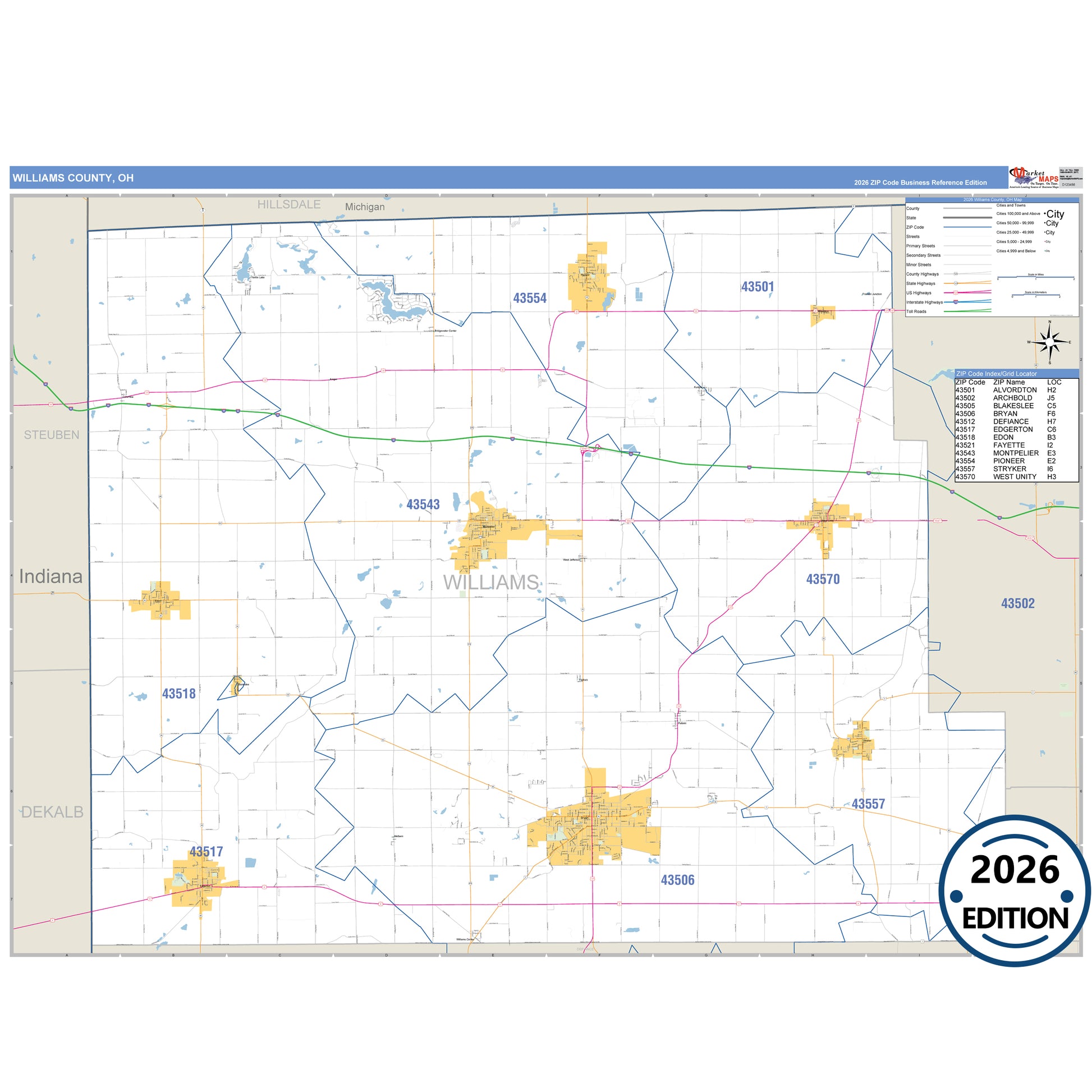 The Business Reference Style Williams County, OH is a detailed map that includes all towns, cities, major roadways, and highways. Available in multiple wall map sizes, perfect for home, school, office, or business display.