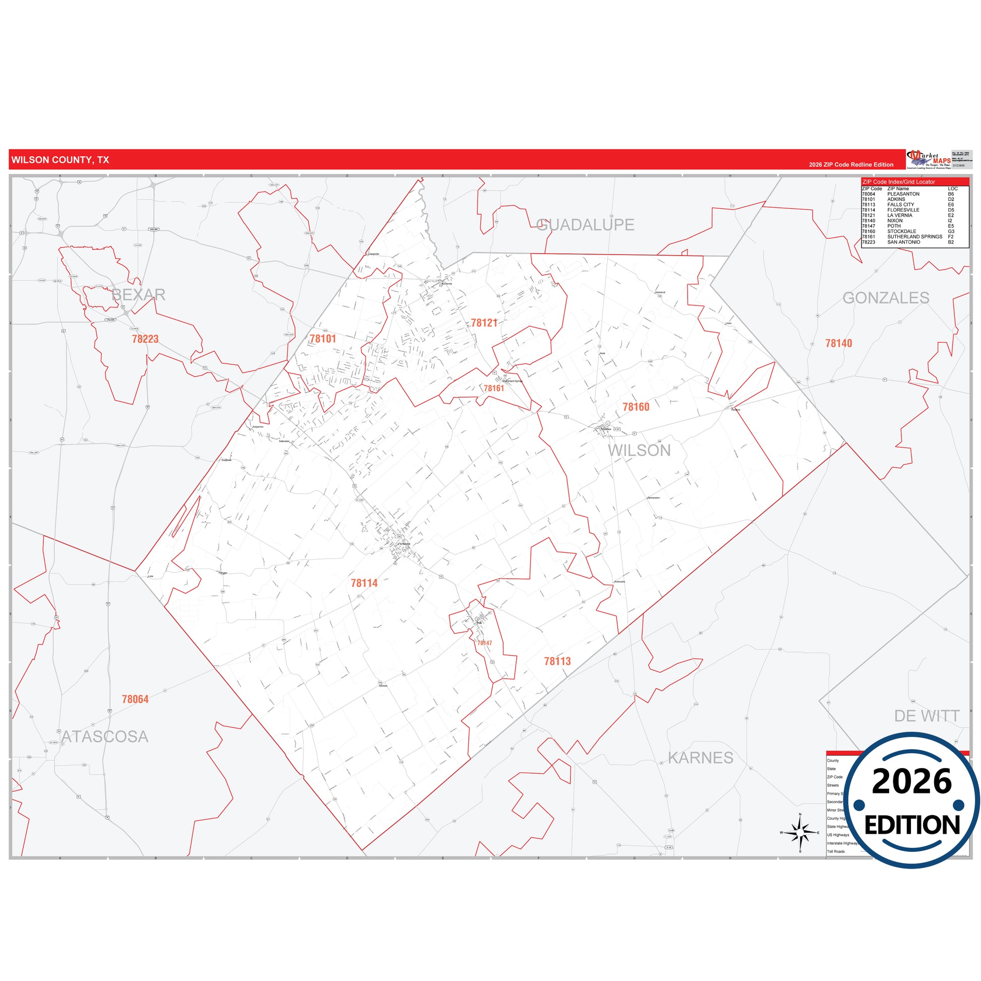 The RedLine Style map of Wilson County, TX shows ZIP code areas overlaid on a detailed road network of Wilson County, Texas. Ideal for drawing locations, territories, and other applications. Base map features include all major streets and highways labeled, cities and towns, county and state boundaries, neighborhood names, railroads, and a clean white background suitable for marking and planning.