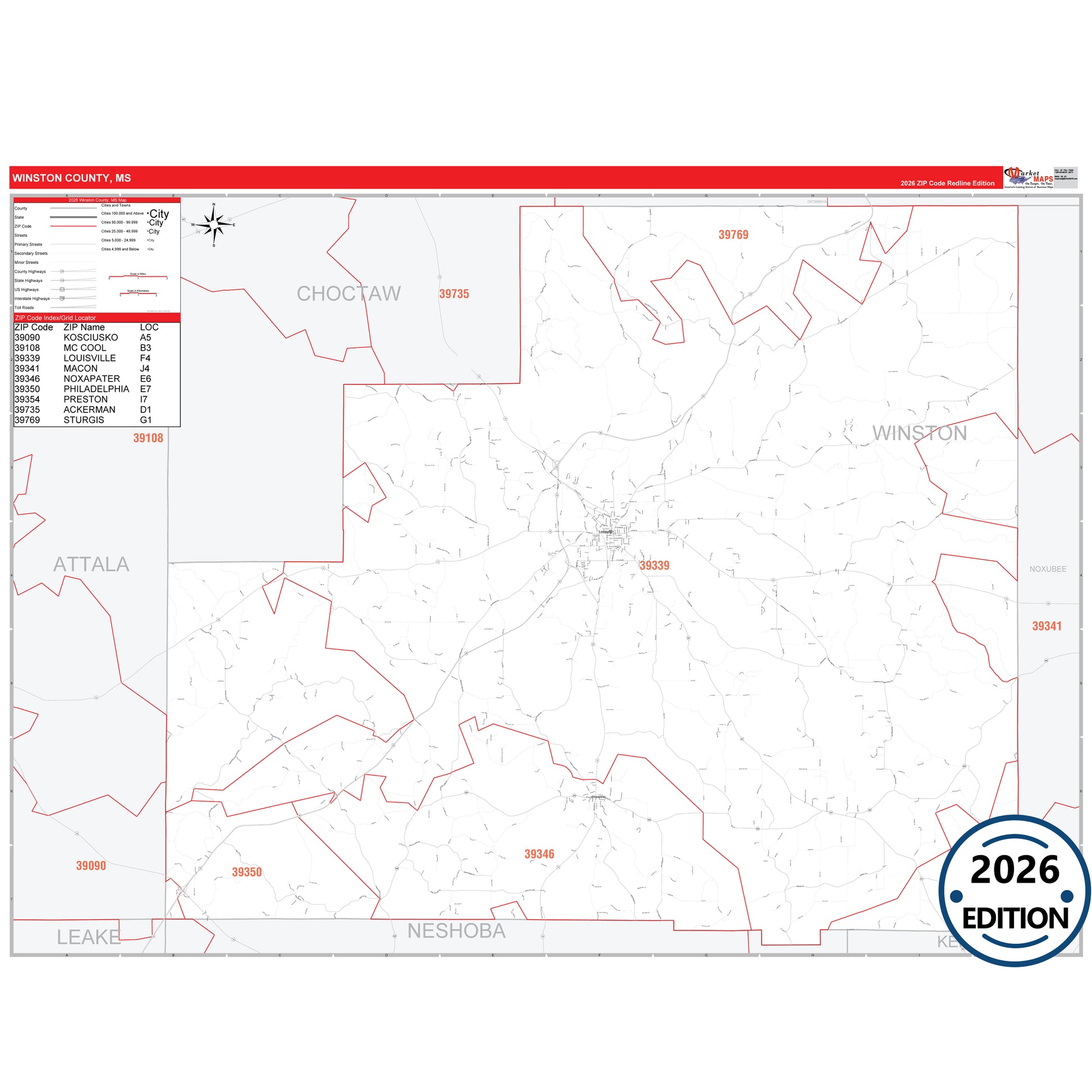 The RedLine Style map of Winston County, MS shows ZIP code areas overlaid on a detailed road network of Winston County, Mississippi. Ideal for drawing locations, territories, and other applications. Base map features include all major streets and highways labeled, cities and towns, county and state boundaries, neighborhood names, railroads, and a clean white background suitable for marking and planning.