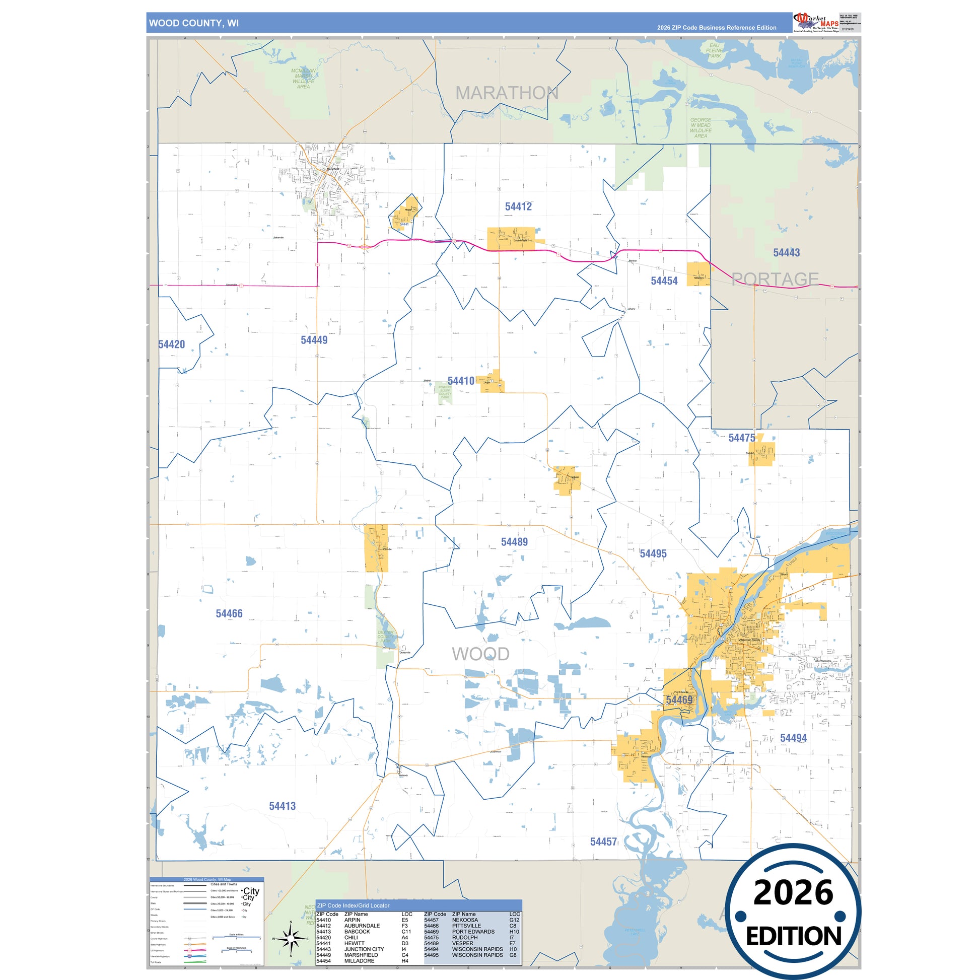 The Business Reference Style Wood County, WI is a detailed map that includes all towns, cities, major roadways, and highways. Available in multiple wall map sizes, perfect for home, school, office, or business display.