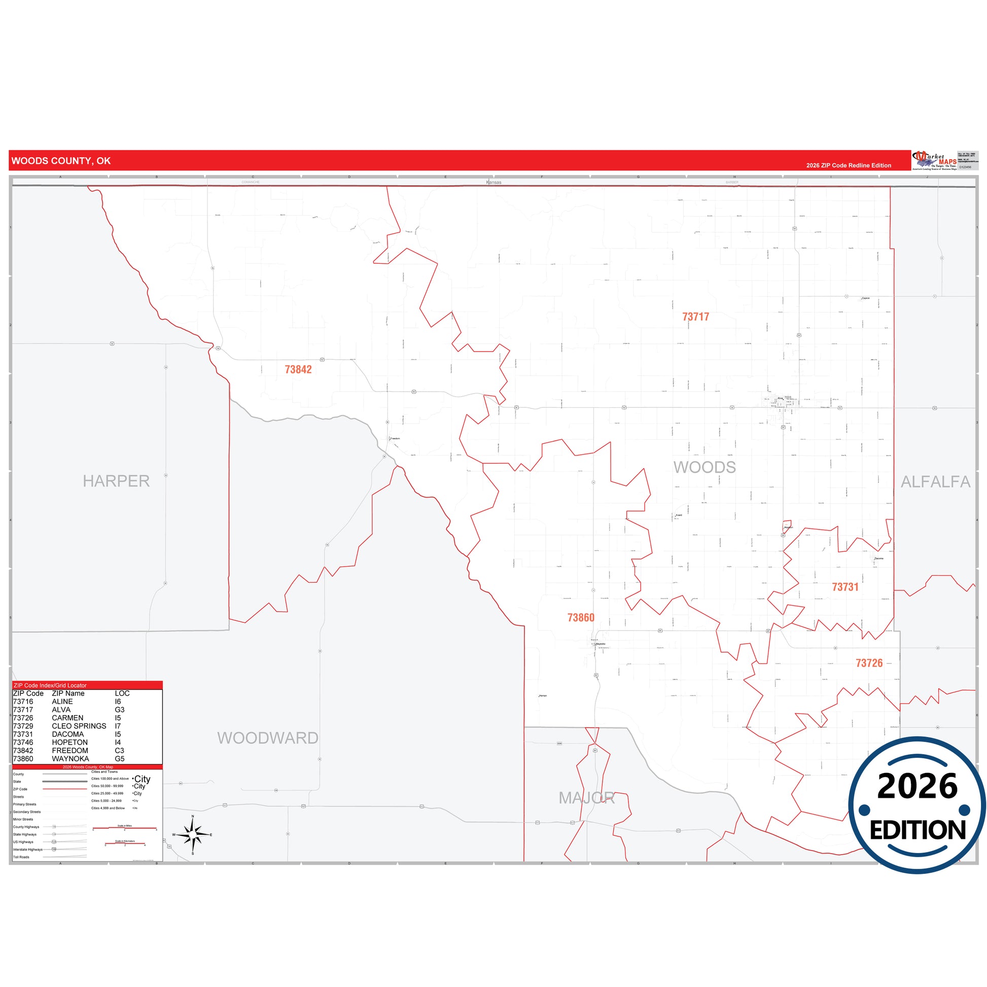 The RedLine Style map of Woods County, OK shows ZIP code areas overlaid on a detailed road network of Woods County, Oklahoma. Ideal for drawing locations, territories, and other applications. Base map features include all major streets and highways labeled, cities and towns, county and state boundaries, neighborhood names, railroads, and a clean white background suitable for marking and planning.