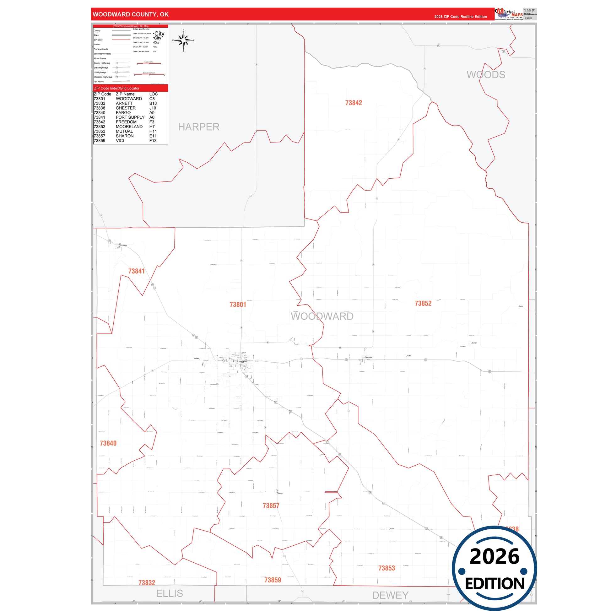 The RedLine Style map of Woodward County, OK shows ZIP code areas overlaid on a detailed road network of Woodward County, Oklahoma. Ideal for drawing locations, territories, and other applications. Base map features include all major streets and highways labeled, cities and towns, county and state boundaries, neighborhood names, railroads, and a clean white background suitable for marking and planning.