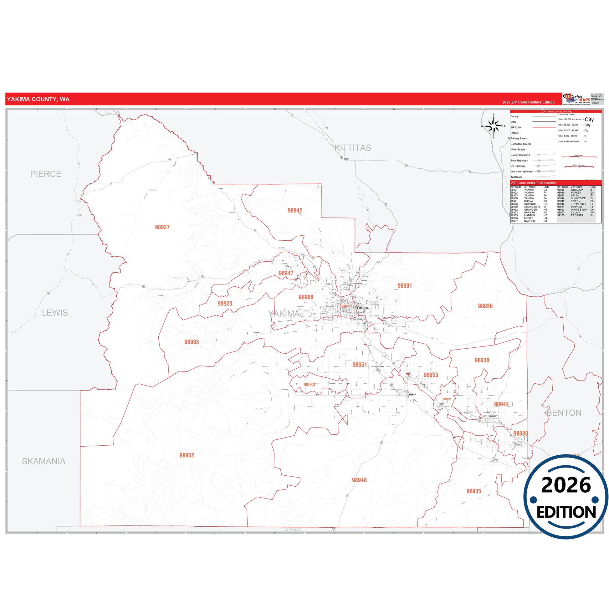 The RedLine Style map of Yakima County, WA shows ZIP code areas overlaid on a detailed road network of Yakima County, Washington. Ideal for drawing locations, territories, and other applications. Base map features include all major streets and highways labeled, cities and towns, county and state boundaries, neighborhood names, railroads, and a clean white background suitable for marking and planning.